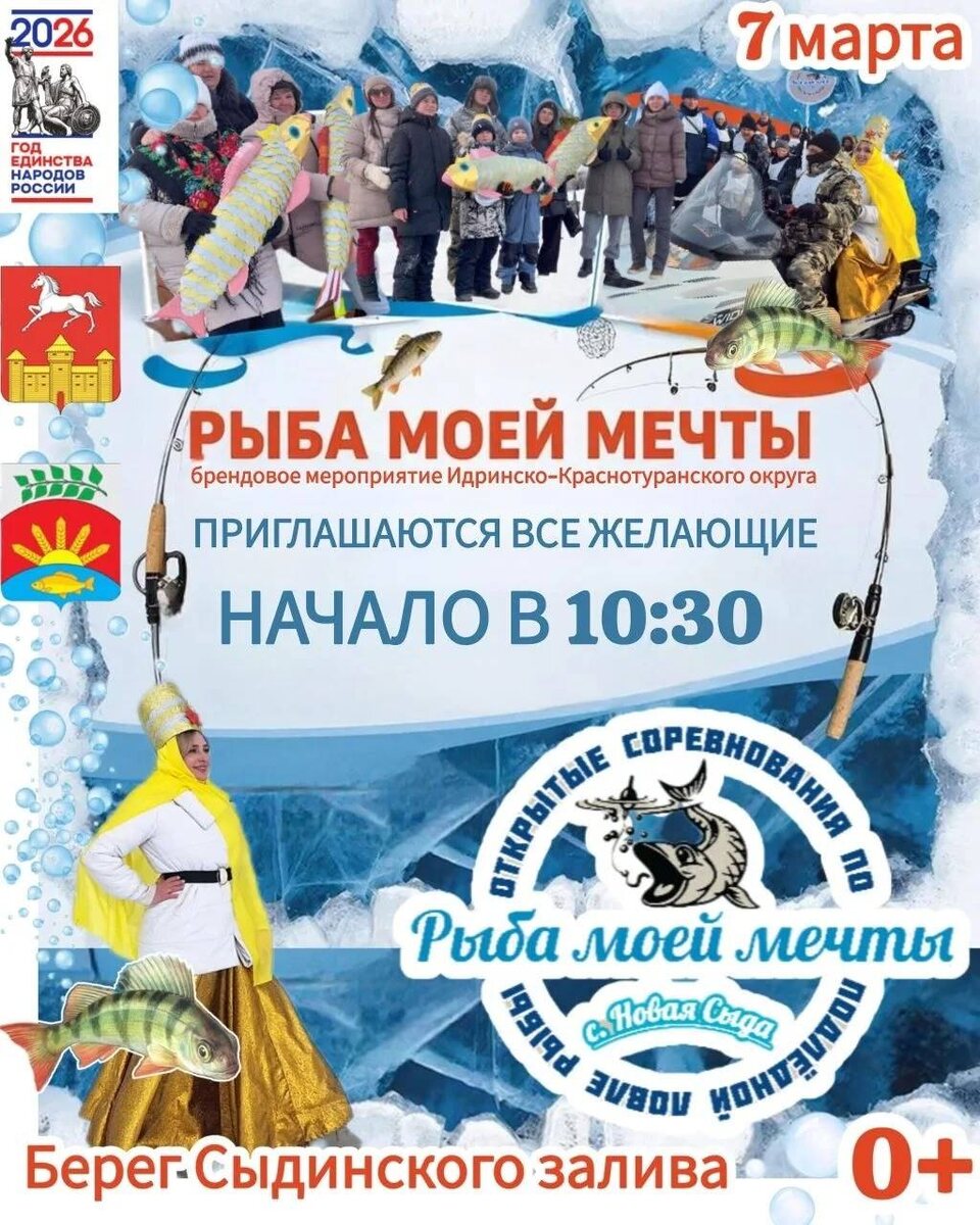 ! Приглашаем всех любителей рыбалки и семейного отдыха принять участие в уникальном мероприятии «Рыба моей мечты», которое состоится на живописном побережье Сыдинского залива Идринско-Краснотуранского округа Красноярского края. ▌ 📍 Место встречи: Сыдинский залив, Идринско-Краснотуранский округ, Красноярский край. Здесь вас ждут потрясающие виды, интересная программа и уникальная возможность поймать рыбу своей мечты! ⏳ Дата и время: Мероприятие пройдёт 7 марта 2026 года, чтобы каждый участник смог насладиться отдыхом и испытать удачу на рыбалке.