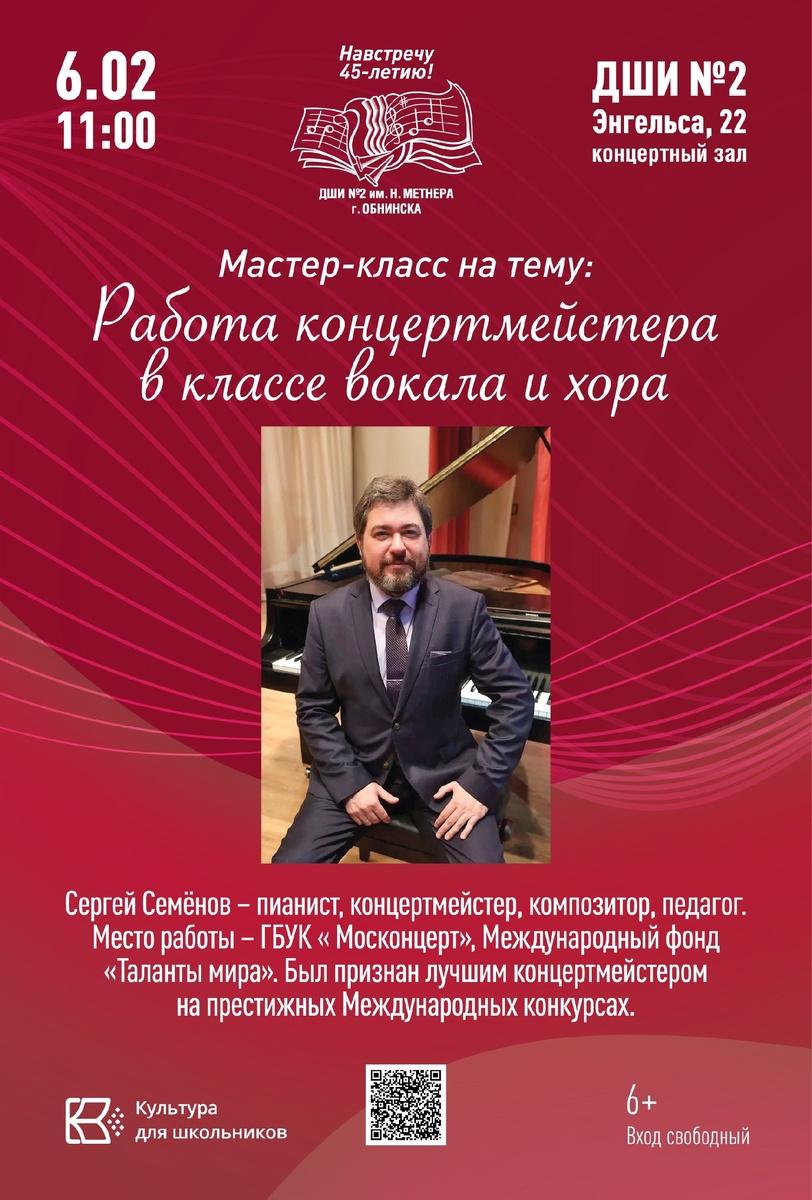 ⚡6 февраля в 11:00 в ДШИ №2 им. Н. Метнера пройдёт мастер-класс «Работа концертмейстера в классе вокала и хора».
