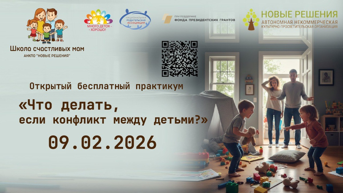 ? 🔔Приглашаем вас в понедельник, 9 февраля, в 12-00 мск на очередное занятие в бесплатной онлайн «Школе счастливых мам»! ✅Что ждёт вас на занятии: - Узнаете, откуда берутся ссоры и конфликты между детьми. - Раскроете, какие действия родителей случайно провоцируют конфликты. - Освоите правильную реакцию на детские споры, чтобы укрепить их взаимоотношения. - Поймёте, как ссоры способствуют развитию социальных навыков и умения договариваться. Вебинар проведет Наталья Григорьевна Калашникова, доктор пед. наук, профессор, автор и руководитель проекта. ➡️Постарайтесь прийти онлайн, по техническим причинам вебинары записываются не всегда! Для того, чтобы присоединиться к занятию, используйте QR-код или эту ссылку: https://pruffme.com/landing/u2631789/20260209_17childconf 🔅Подробнее про проект читайте здесь 📌Все новости «Школы счастливых мам» в нашем канале Проект "Школа счастливых многодетных мам» реализуется АНКПО “Новые решения” при поддержке Фонда Президентских грантов