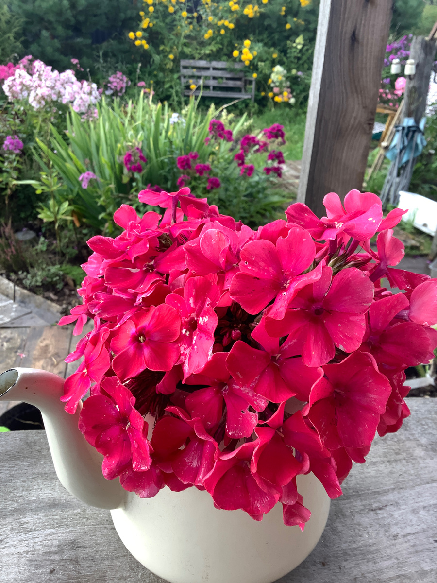 Когда очередная летняя буря повалила несколько стеблей флокса Маргарита, я конечно расстроилась. И толстых, надо сказать, стеблей. Не былинок. Но нет худа без добра - красивые шапки сразу украсили мой дачный столик, а черенки именно от Маргариты, посаженные в грунт, быстро прижились
