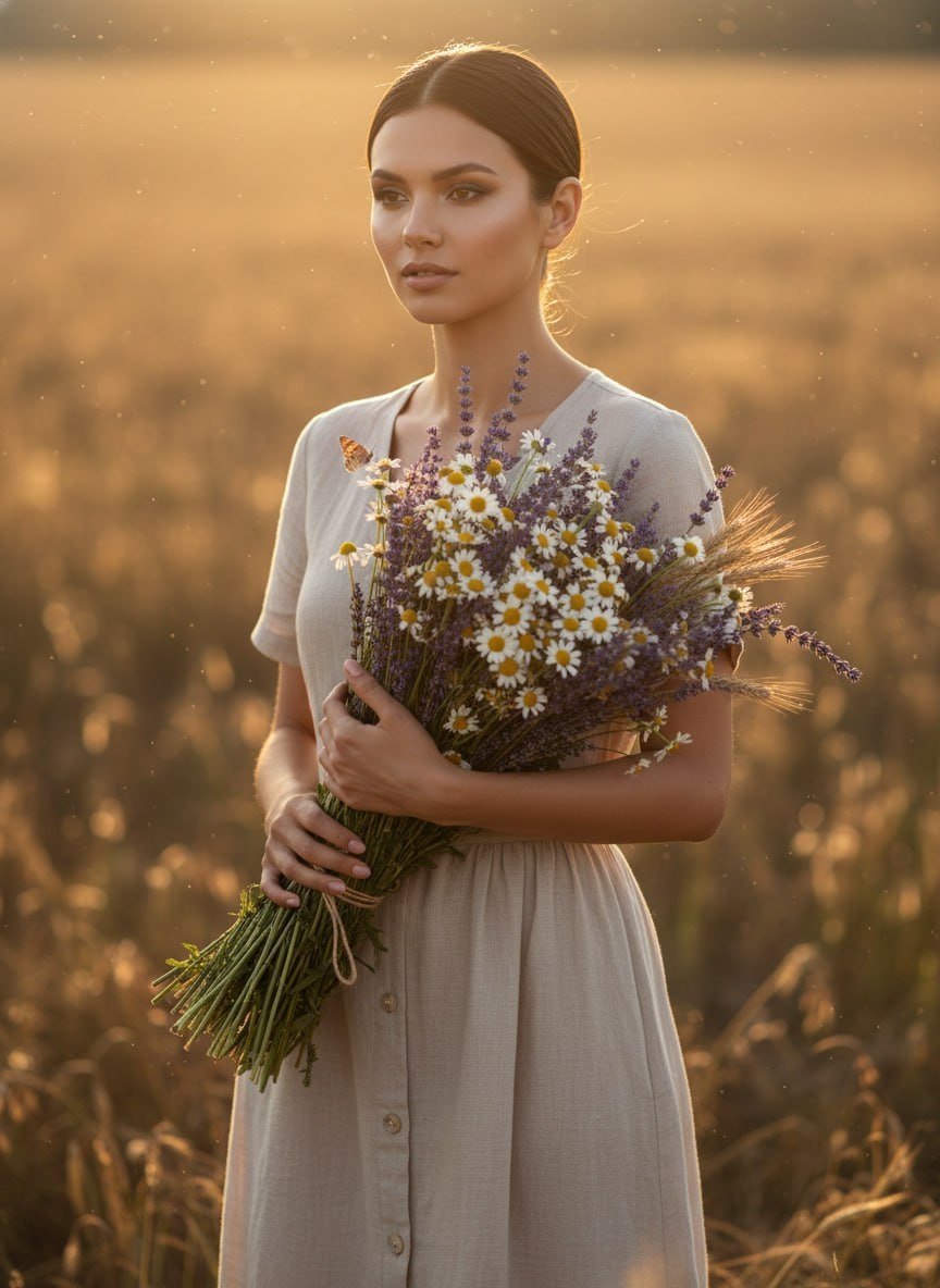 🔥 Забудь про скучные открытки из поиска. Теперь в центре сюжета — ты. Закидываем селфи в бот, выставляем сходство на максимум и получаем нереальный кадр в стиле рустик. Чистая эстетика и никакого визуального шума. ⚡️ Используя загруженное селфи в качестве точного эталона лица со 100-процентным совпадением (--face_fidelity 1.0), создайте фотографию по описанию, сохранив полное сходство с оригиналом. Эстетичный [кинематографичный портрет] женщины в стиле рустик. Она [стоит на фоне залитого солнцем луга, нежно прижимая к груди большой букет]. Одета в [светлое льняное платье миди на пуговицах с коротким рукавом]. В её руках [густой букет из полевой лаванды, аптечных ромашек и золотистых колосьев пшеницы, перевязанный бечёвкой]. [Тёплый контровой свет заходящего солнца] создает мягкий ореол вокруг волос. Вокруг [летает крошечная бабочка и парят золотистые пылинки]. [Средний план, взгляд слегка отведен в сторону]. Атмосфера абсолютной нежности, фотореализм, высокая детализация кожи, объек