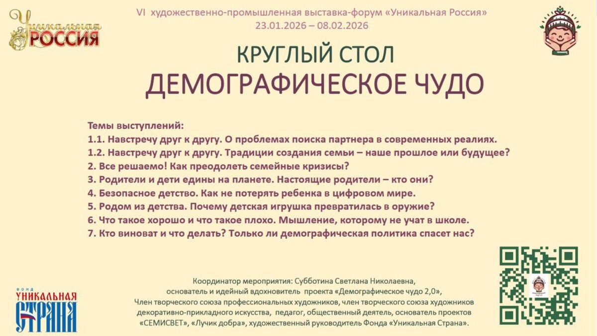 Круглого стола «Демографическое чудо» Дата и время: 5 февраля 2026 года, с 14:00 до 16:00 Место проведения: г. Москва, ул. Ильинка, д. 4, Гостиный двор, 1 этаж, конференц-зал. Начало регистрации в 13:00 14:00 – 14:05 Открытие Круглого стола, приветственное слово. Субботина Светлана Николаевна, основатель и идейный вдохновитель проекта «ДЕМОГРАФИЧЕСКОЕ ЧУДО 2,0», член творческого союза профессиональных художников (ТСПХ), член творческого союза художников декоративно-прикладного искусства (ТСХДПИ), педагог, общественный деятель, основатель проектов «СЕМИСВЕТ», «Лучик добра», художественный руководитель Фонда «Уникальная Страна». 14:05 – 14:15 Навстречу друг к другу. О проблемах поиска партнера в современных реалиях. Артем Мартиросян, общественный деятель, специалист в области человеческих отношений, глубинных социальных связей и архитектуры доверия, основатель проекта «Клуб знакомств «ЛИЦА». 14:15 – 14:25 Навстречу друг к другу. Традиции создания семьи – наше прошлое или будущее? Олеся О