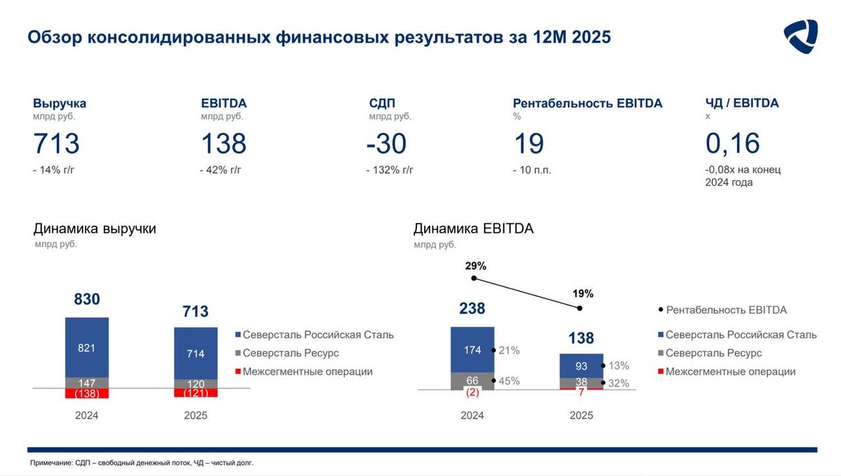 Всем доброго! ⚙️ В последние полтора года российские производители стали столкнулись с сочетанием неблагоприятных факторов как на внутреннем, так и на внешнем контуре. Внутри РФ потребление стали заметно сократилось, прежде всего в строительном секторе. 🌐 На внешних рынках наблюдалось снижение цен (в первую очередь из-за замедления внутреннего спроса в Китае и роста экспортных поставок) и ухудшение конкурентных позиций российской стали на фоне укрепления рубля и усиления конкуренции со стороны китайских производителей. Что по результатам за 2025 год? 🔴 Выручка: 712,9 млрд руб. (-14% г/г) 🔴 EBITDA: 137,6 млрд руб. (-42% г/г), маржа 19% (-10 п.п.) 🔴 Чистая прибыль: 32,0 млрд руб. (-79% г/г) 🔴 Свободный денежный поток (СДП): -30,5 млрд руб. (против +96,8 млрд руб. годом ранее) 🟠 Инвестиции (CAPEX): 173,5 млрд руб. (+46% г/г). 📉 Причины подобных результатов понятны. Это комбинация: (1) слабой ценовой конъюнктуры, о которой говорилось выше и (2) разового эффекта от обесценения ч