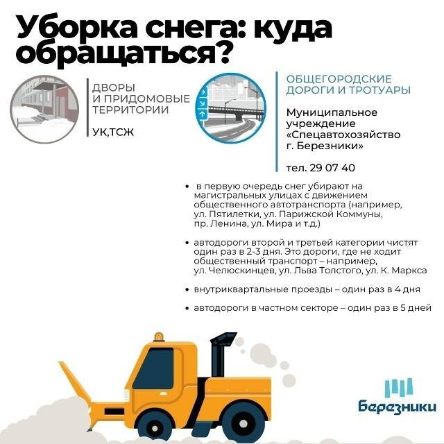 Зима в разгаре, снегопады продолжаются — поэтому ещё раз напоминаем, куда обращаться по вопросам уборки снега ⤵️ 🚜 Дворы и придомовые территории: За уборку отвечают управляющие компании и ТСЖ. Если работы не выполняются: 📞 отдел контроля управления городского хозяйства — 20-19-21 💻 интернет-приёмная Инспекции госжилнадзора — vk.cc/cSGare 🏬 Территории у ТЦ и магазинов: Замечания по содержанию можно направить в контрольное управление: 📞 20-19-50, доб. 2502 🛣 Городские дороги и тротуары: Уборку выполняет МУ «Спецавтохозяйство г. Березники». Сообщить о проблемах можно в диспетчерскую службу: 📞 29-07-40 Сохраняйте памятку и делитесь с теми, кому актуально 💙