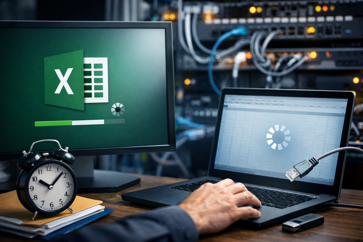 «Открываю файл Excel на сетевом диске и каждый раз жду по 20–30 секунд. Иногда кажется, что программа вообще зависла». Ситуация знакомая. Особенно в офисах, где все документы лежат на файловом сервере. Начинаем разбираться. Файл не большой, компьютер не слабый, но при открытии по сети Excel заметно «думает». Изучаем ситуацию подробней, проблема проявляется следующими признаками: Excel долго открывает файл с сетевого ресурса, При первом открытии появляется белое окно, В строке состояния надпись «Обработка…», Иногда создается ощущение, что программа зависла. Если тот же файл скопировать на рабочий стол, он открывается почти мгновенно. Первым делом проверяем очевидное: Далее обращаем внимание на поведение Excel. Задержка появляется именно в момент открытия файла, а не при работе с ним. Значит, проблема кроется не в сети и не в самом документе. Причина оказалась неочевидной, но довольно распространенной. Excel при открытии файлов по сети пыта