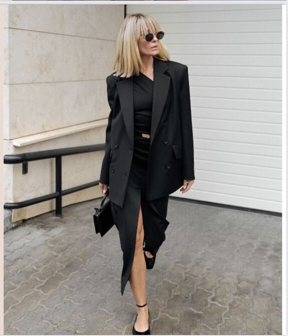 Сочетание «платье + жакет» тоже, но изменилась логика подачи. Сейчас это не формула офиса, а удобная стильная база, которую можно адаптировать под настроение, возраст и ситуацию.