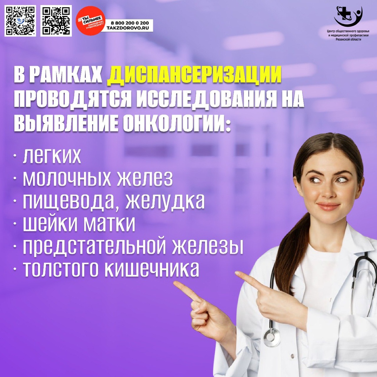 Диспансеризация — это ваш регулярный «чек-ап», который помогает выявить риски или ранние признаки онкологических заболеваний. Не упускайте эту возможность! Ключевые исследования, направленные на раннее выявление рака: Легкие: низкодозовая компьютерная томография (для групп риска). Молочные железы: маммография. Пищевод и желудок: эзофагогастродуоденоскопия. Шейка матки: цитологический мазок (ПАП-тест) и ВПЧ-тестирование. Предстательная железа: анализ ПСА (по показаниям). Толстый кишечник: анализ кала на скрытую кровь, колоноскопия. Регулярное прохождение этих обследований — доказанный способ сохранить здоровье и спокойствие. Позаботьтесь о себе вовремя! ⬇️ Сохраняйте инфографику-напоминалку и делитесь ею с близкими. #НеделяПрофилактикиОнкологическихЗаболеваний #профилактикаРака #здоровоебудущее #здоровоебудущее62 #ЗдороваяРязань