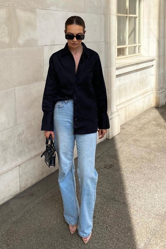 У черной рубашки есть важное преимущество: она собирает образ. Делает его четче, аккуратнее, визуально стройнее. Особенно если ткань плотная и держит форму.