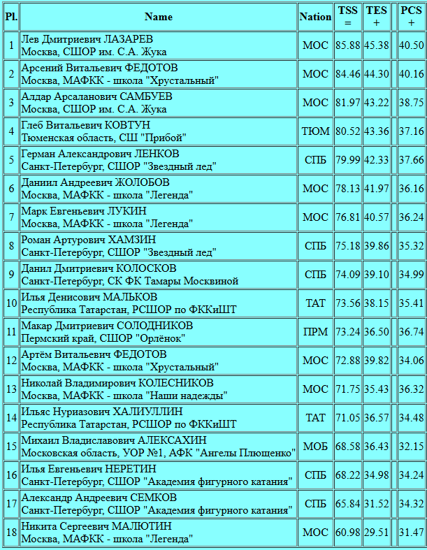 Герман Ленков (79.99 - 5 место) от турнира к турниру доказывает свое право находиться в числе лучших юниоров России. В короткой программе без четверных прыжков ему уже тесно, а это верный признак того, что он вышел на новый уровень надежности и стабильности. В произвольной программе будет очень интересная борьба за медаль и Герман к ней определенно готов.