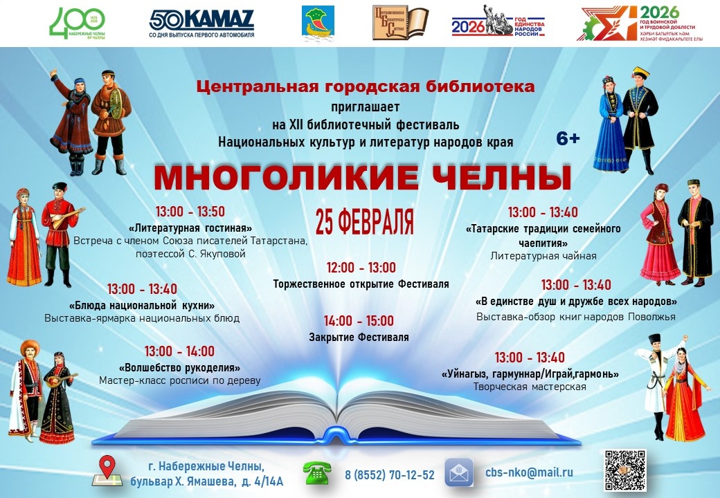 25 февраля в Центральной городской библиотеке состоится Библиотечный фестиваль национальных культур и литератур народов края – «Многоликие Челны». Фестиваль организуется национально-краеведческим отделом ЦГБ. На фестивале примут участие представители разных национальностей, проживающих на территории города Набережные Челны. В 12.00 часов в актовом зале Центральной городской библиотеки состоится торжественное открытие фестиваля. В рамках Библиотечного фестиваля «Многоликие Челны» предусмотрена работа шести увлекательных и познавательных площадок. Площадка – «Литературная гостиная»организована в национально – краеведческом отделе библиотеки. Здесь пройдет встреча с писателем, членом Союза писателей Республики Татарстан С. Якуповой. Для желающих прочитать стихи будет работать свободный микрофон. Площадка «Волшебство рукоделия»посвящена ремеслам нашего края. Если вы хотите посмотреть выставки народных промыслов и ремесел, принять участие в мастер-классах росписи по дереву. – то добро пожал