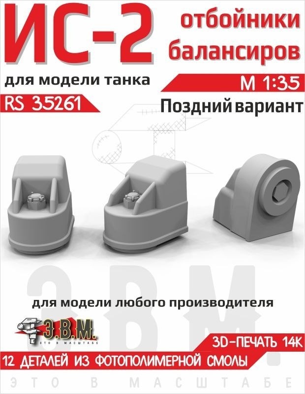Севастопольская Э.В.М. выпустила на 3D-принтере поздний вариант (примерно с августа 1944 г.) отбойников балансиров (с усилением) для моделей танков ИС-2 и САУ на их базе в масштабе 1/35.