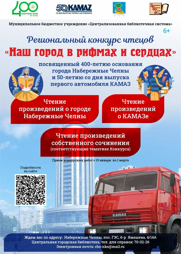 С 15 января по 1 марта 2026 года МБУ «Централизованная библиотечная система» при поддержке управления культуры Исполнительного комитета города Набережные Челны приглашает детей от 6 лет и взрослых жителей города без ограничения по возрасту принять участие в региональном конкурсе чтецов «Наш город в рифмах и сердцах», посвященном 400-летию основания города Набережные Челны и 50-летию со дня выпуска первого автомобиля «КамАЗ». Форма проведения конкурса очно-заочная.