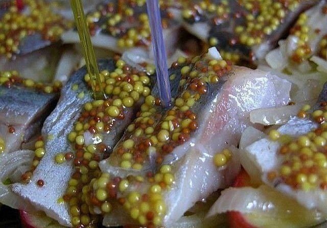 Ингредиенты: - 2 соленые сельди; - 2 луковицы; - 2 яблока; - 3 ст.л французской горчицы; - 1 ч.л уксуса; - 3 ст.л растительного масла; - зеленый лук. Приготовление: Сельдь разделать на филе. Луковицу нарезать полукольцами. На дно лотка выложить половину лука, сверху разложить филе сельди. Смазать сельдь горчицей. Для маринада смешать растительное масло и уксус, полить сельдь и засыпать второй половиной лука. Оставить мариноваться на 1 час. Из яблок удалить сердцевину. Нарезать полукруглыми дольками толщиной около 0,3 см. Обжарить на растительном масле с 2х сторон. Выложить на блюдо. Оставшуюся луковицу нарезать полукольцами и так же обжарить на растительном масле. На каждую дольку яблока положить немного обжаренного лука. Замаринованное филе сельди аккуратно освободить от лука, сохранив при этом горчичный слой, и нарезать сельдь кусочками по размеру яблочных долек. Уложить по кусочку сельди на лук и дольку яблока. Скрепить получившиеся "канапе" шпажками. Украсить зеленым луком. Ангел