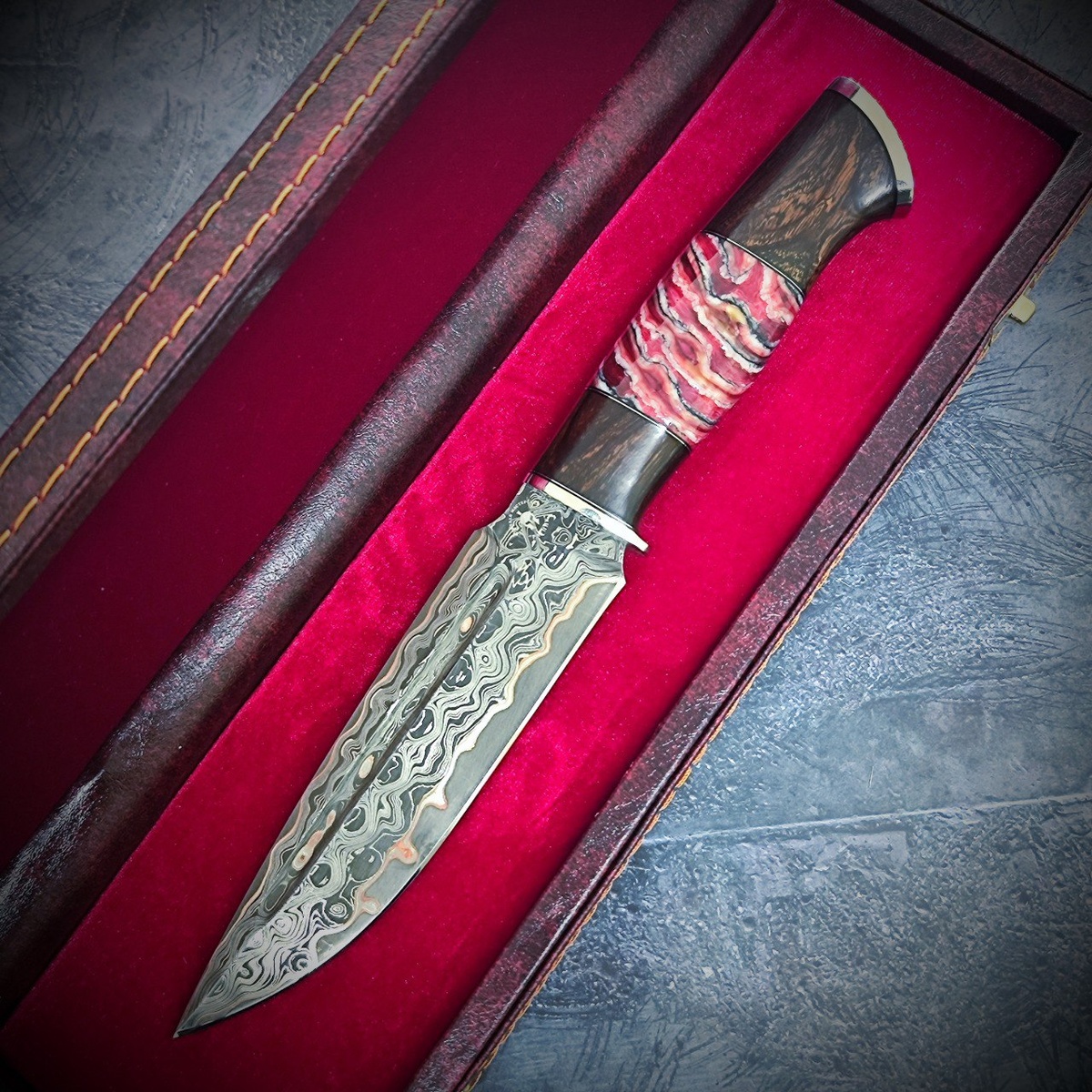 : Сталь ламинат (центр У8) Твёрдость 58-60 HRC Рукоять Ironwood и зуб мамонта Больстер нейзильбер Монтаж сквозной Общая длина ножа 285 мм Длина клинка 155 мм Длина рукояти 130 мм Ширина клинка 38 мм Толщина клинка в обухе 4,5-4,6 мм Полировка клинка стоунвош В комплекте футляр (возможна покупка ножа без футляра — с ножнами. Стоимость уточняйте у менеджера). 💥 Нож изготовлен из высококачественной ламинированной стали, где центральная часть выполнена из стали У8, известной своей прочностью и способностью сохранять остроту. Твердость клинка составляет 58-60 HRC, что обеспечивает отличные эксплуатационные характеристики и долговечность. Рукоять ножа выполнена из редкого и прочного железного дерева, которое обладает не только эстетической привлекательностью, но и высокой устойчивостью к механическим повреждениям и воздействию влаги. В дополнение к этому, в конструкции рукояти использован зуб мамонта. 🏷️ 22 000₽ 👉 Заказать по ссылке: t.me/matbel7 В этом посте есть большое видео, которо