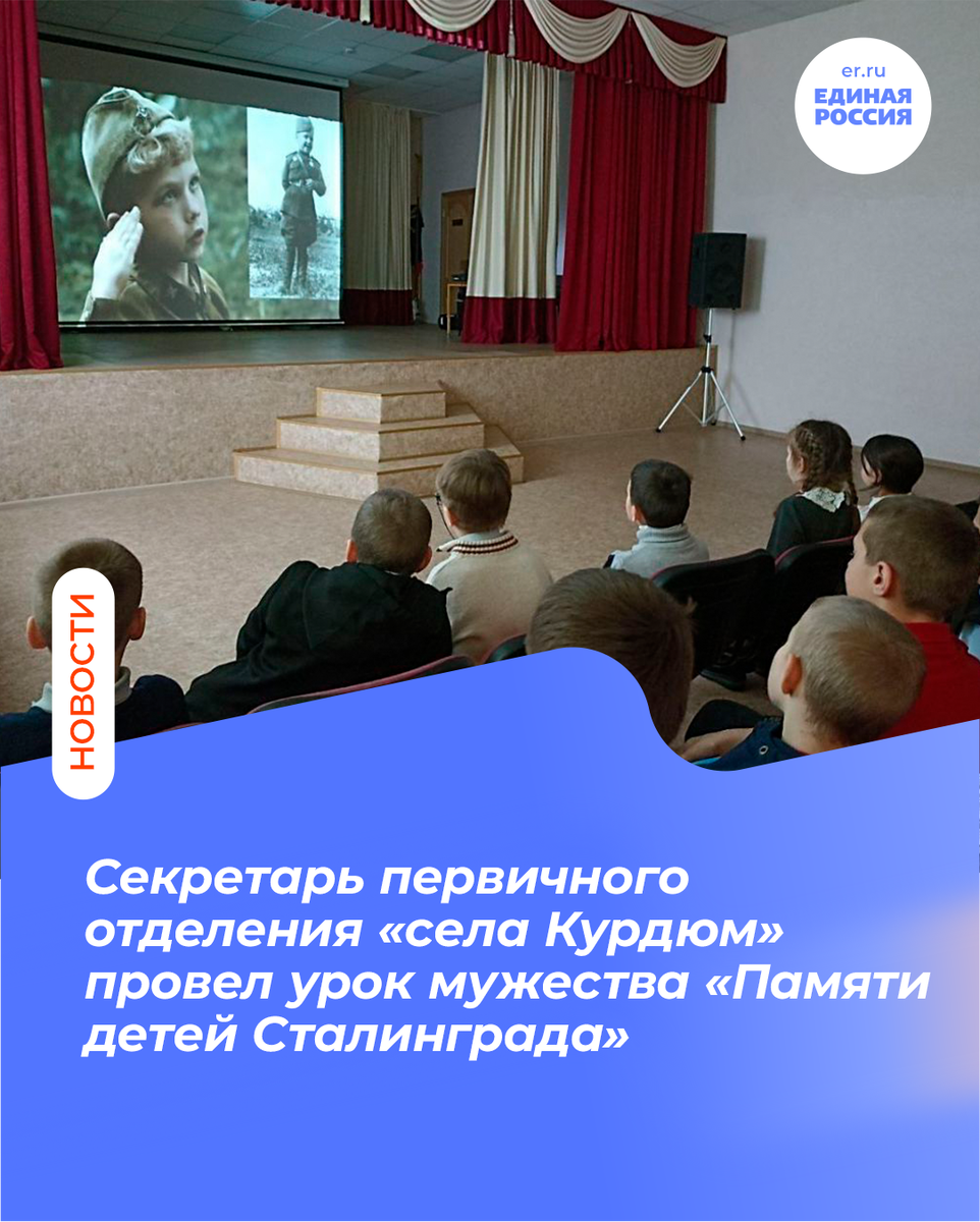 В Доме культуры села Курдюм секретарь первички Наталия Клюева провела урок мужества «Дети Сталинграда». Мероприятие было посвящено одной из самых героических страниц Великой Отечественной войны – Сталинградской битве.