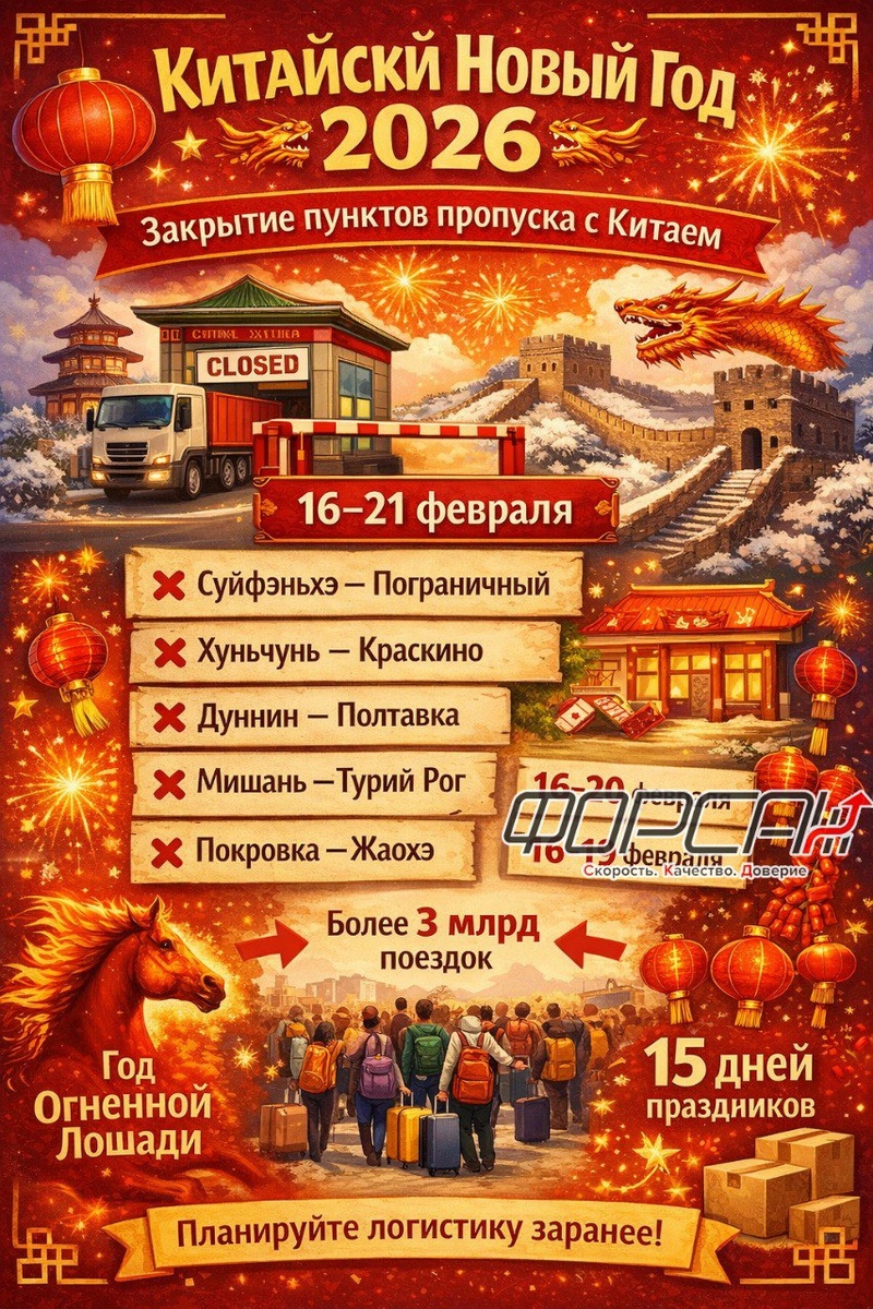 🇨🇳🎊 В середине февраля в Китае начинается празднование Лунного Нового года — главного и самого продолжительного праздника в стране. В этот период традиционно приостанавливается работа не только заводов и банков, но и пунктов пропуска на границе с КНР. 📅 График закрытия пунктов пропуска в феврале 2026 года: ❌ МАПП Суйфэньхэ – Пограничный 16–20 февраля ❌ МАПП Хуньчунь – Краскино 17–21 февраля ❌ ДАПП Дуннин – Полтавка 16–20 февраля ❌ ДАПП Мишань – Турий Рог 16–20 февраля ❌ Покровка – Жаохэ (Хабаровский край) 16–19 февраля ⚠️ Рекомендуем заранее учитывать эти даты при планировании автоперевозок и закладывать дополнительные сроки на доставку. 🐉 Немного интересного о Китайском Новом годе • В 2026 году он приходится на Год Огненной Лошади — символ энергии, скорости и резких рывков (что логисты обычно ощущают буквально 😅). • Празднование длится 15 дней, но фактически страна «замедляется» минимум на 2–3 недели. • В этот период происходит крупнейшая миграция людей в мире — более