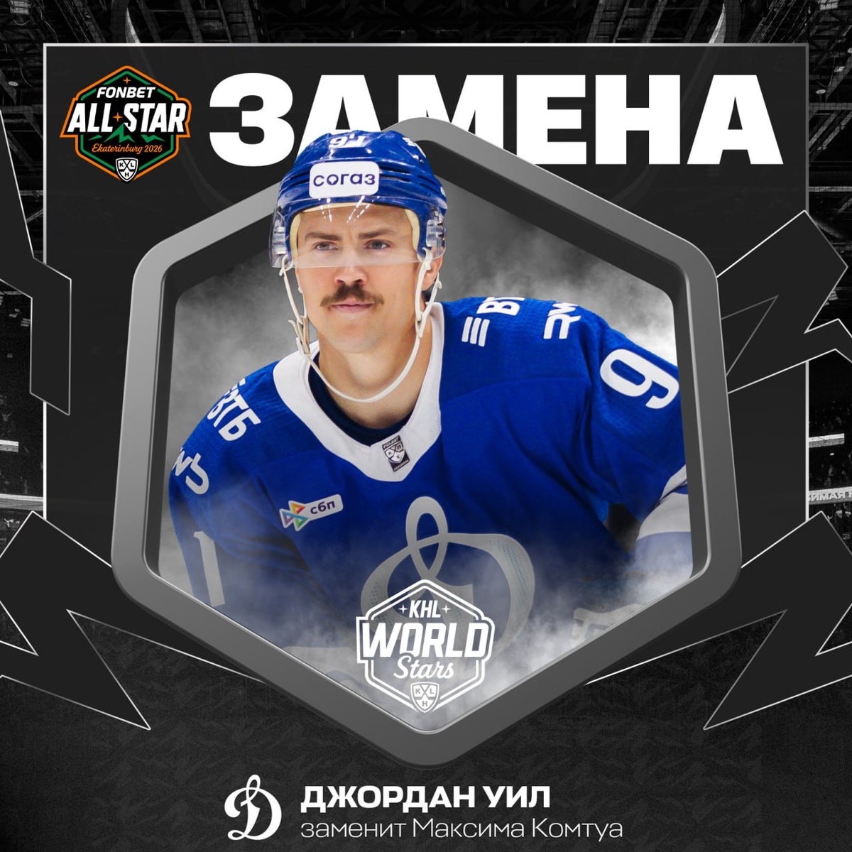 π΅ ΠΠ΅Π»ΠΎ-Π³ΠΎΠ»ΡΠ±Π°Ρ ΡΠΎΠΊΠΈΡΠΎΠ²ΠΊΠ° Π² ΠΊΠΎΠΌΠ°Π½Π΄Π΅ KHL World Stars: ΠΠΆΠΎΡΠ΄Π°Π½ Π£ΠΈΠ» Π·Π°ΠΌΠ΅Π½ΠΈΡ Π½Π° Π·Π²Π΅Π·Π΄Π½ΠΎΠΌ ΡΠΈΠΊΠ΅Π½Π΄Π΅ ΡΠ²ΠΎΠ΅Π³ΠΎ ΠΎΠ΄Π½ΠΎΠΊΠ»ΡΠ±Π½ΠΈΠΊΠ° ΠΠ°ΠΊΡΠΈΠΌΠ° ΠΠΎΠΌΡΡΠ°, ΠΊΠΎΡΠΎΡΡΠΉ Π½Π΅