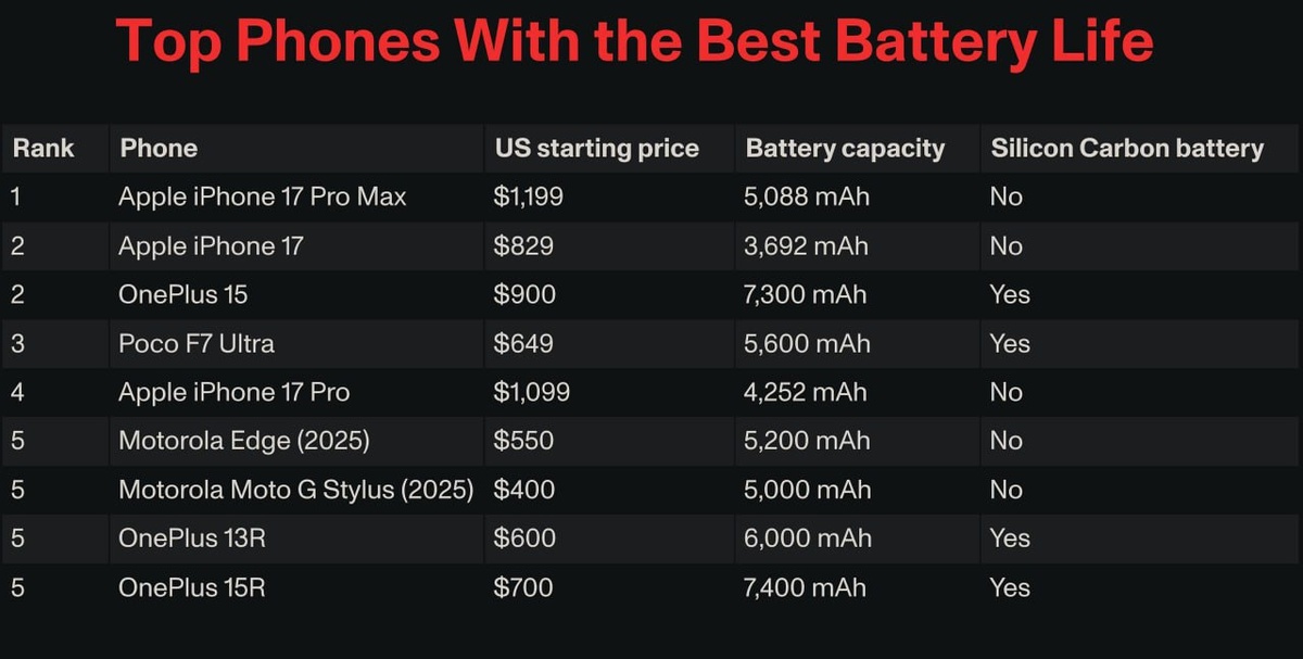 ΠΠ΅ΡΠ΅Π΄ Π²Π°ΠΌΠΈ ΡΠ΅ΠΉΡΠΈΠ½Π³ Π°Π²ΡΠΎΠ½ΠΎΠΌΠ½ΠΎΡΡΠΈ 35 ΡΠΌΠ°ΡΡΡΠΎΠ½ΠΎΠ² ΠΎΡ Π°ΠΌΠ΅ΡΠΈΠΊΠ°Π½ΡΠΊΠΎΠ³ΠΎ ΠΈΠ·Π΄Π°Π½ΠΈΡ CNET (ΡΠ°Π±ΠΎΡΠ°Π΅Ρ Π°ΠΆ Ρ 1994 Π³ΠΎΠ΄Π°). iPhone 17 Pro Max Π·Π°Π½ΡΠ» ΠΏΠ΅ΡΠ²ΠΎΠ΅ ΠΌΠ΅ΡΡΠΎ, ΡΠ»Π΅Π΄ΠΎΠΌ ΠΈΠ΄ΡΡ iPhone 17 ΠΈ OnePlus 15. ΠΠ½ΡΠ΅ΡΠ΅ΡΠ½ΠΎ, ΡΡΠΎ Π±Π°Π·ΠΎΠ²ΡΠΉ Π°ΠΉΡΠΎΠ½ ΠΎΠΊΠ°Π·Π°Π»ΡΡ Π½Π΅ ΡΠ»Π°Π±Π΅Π΅ ΠΊΠΎΠ½ΠΊΡΡΠ΅Π½ΡΠ°, Π½Π΅ΡΠΌΠΎΡΡΡ Π½Π° ΠΏΠΎΡΡΠΈ Π²Π΄Π²ΠΎΠ΅ ΠΌΠ΅Π½ΡΡΡΡ Π±Π°ΡΠ°ΡΠ΅Ρ. ΠΠ°ΠΊ ΡΠ΅ΡΡΠΈΡΠΎΠ²Π°Π»ΠΈ: β