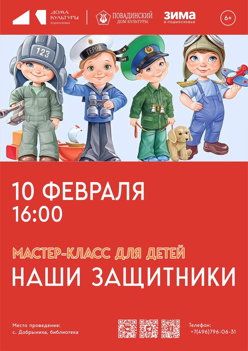 ✨ 🪖Готовимся к 23 февраля!🪖 💪Приглашаем вас и ваших детей на тёплый и душевный мастер-класс «Наши защитники», приуроченный ко Дню защитника Отечества! В преддверии 23 февраля мы подготовили особенную встречу, где каждый ребёнок сможет своими руками создать памятный подарок для папы, дедушки или брата — символ благодарности и уважения к тем, кто бережёт и защищает нас. Мастер-класс пройдёт в уютной творческой обстановке, где дети не только раскроют свои способности к рукоделию, но и узнают, что быть защитником — значит быть смелым, ответственным и заботливым не только на поле боя. 🚫 Возраст: 6+ 📆 10.02.2026🕒16:00 🏢 Павловский сельский дом культуры (СДК) 📍 г.о.Домодедово, дер.Павловское, ул.Вокзальная, д.18 ✅ Мероприятия Домодедово https://dzen.ru/id/66f10385cc4c5a16f7b5fb02 http://vk.com/domodedovo_events http://dzen.ru/domodedovo_events