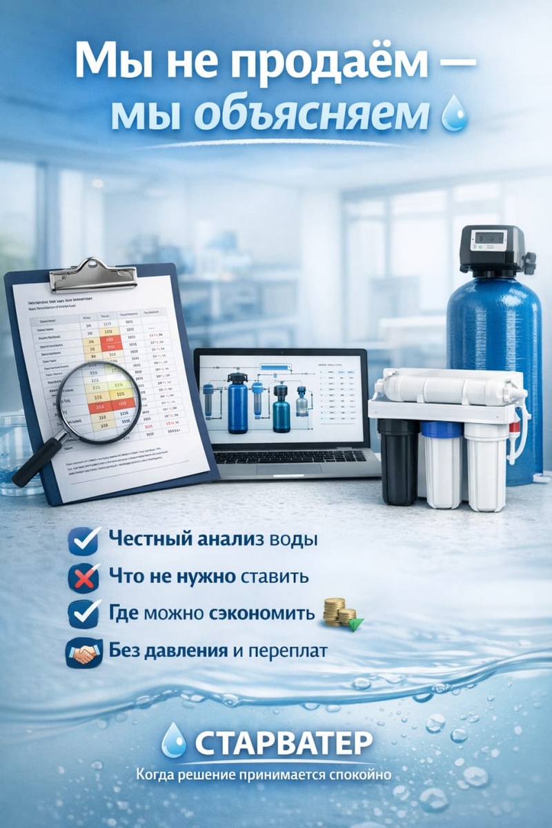 💧 Многие приходят к нам с опасением: «Сейчас начнут что-то навязывать…» 😬 И это нормально. Мы это понимаем 🤝 Поэтому у нас всё начинается не с фильтра и не с цены, а с объяснения 🧠 📊 Разбираем анализ воды простым языком 🔍 Показываем, что действительно есть в воде 🚫 Отсекаем маркетинговые страшилки Иногда мы прямо говорим: ❌ этот фильтр не нужен ❌ вторую колонну можно не ставить 💰 здесь можно сэкономить Потому что наша задача — не продать систему, а чтобы она реально решала вашу проблему ✅ Без давления 🙌 Без «надо срочно» ⏳ Без переплат 💸 Если хотите — просто разберёмся с вашей водой и подскажем, как лучше 👌 📞 Телефон: 8 (812) 628-04-44 🌐 Сайт: starwater.ru ✉️ Почта: info@starwater.ru 💧 СТАРВАТЕР Когда решение принимается спокойно