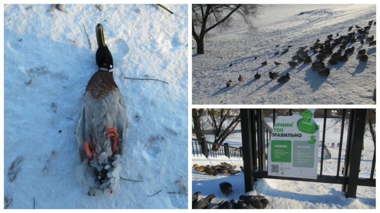 В старом центре города Брянска, на набережной реки Десны, местные волонтёры-зоозащитники обнаружили диких уток с обледенелыми клювами. Одна из них, как минимум, погибла. Тревожное сообщение с просьбой о помощи ко всем неравнодушным брянцам появилось позавчера в ВК-сообществе волонтёров-зоозащитников «Я потерялся! Брянск!» от Галины Брикс: «Нужна помощь утке. Набережная, бывший причал. Самка кряквы с ледяным колпачком на клюве. Заметила её сегодня, когда кормила уток. Голодная.Руками поймать не получалось, так близко не подпускала. Когда я стала снимать куртку, чтобы накинуть на беднягу, все утки отреагировали на такое моё движение и разлетелись». Группа волонтеров во главе со специалистом по диким животным и птицам, руководителем реабилитационного центра «Дом Снежного Барса» Максимом Любимовым выехала для спасения птицы, попавшей в беду. На берегу главной брянской реки было обнаружено несколько таких бедолаг. К сожалению, помочь им не удалось: при любом неосторожном движении вся огромн