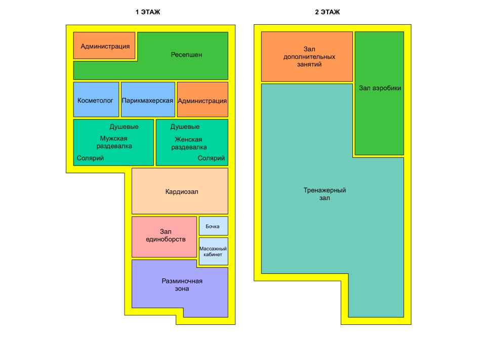 - Продуманное зонирование и планировка: выделите площади для ключевых зон (рецепции, раздевалок, тренажерных залов, кардиозоны, залов групповых программ).