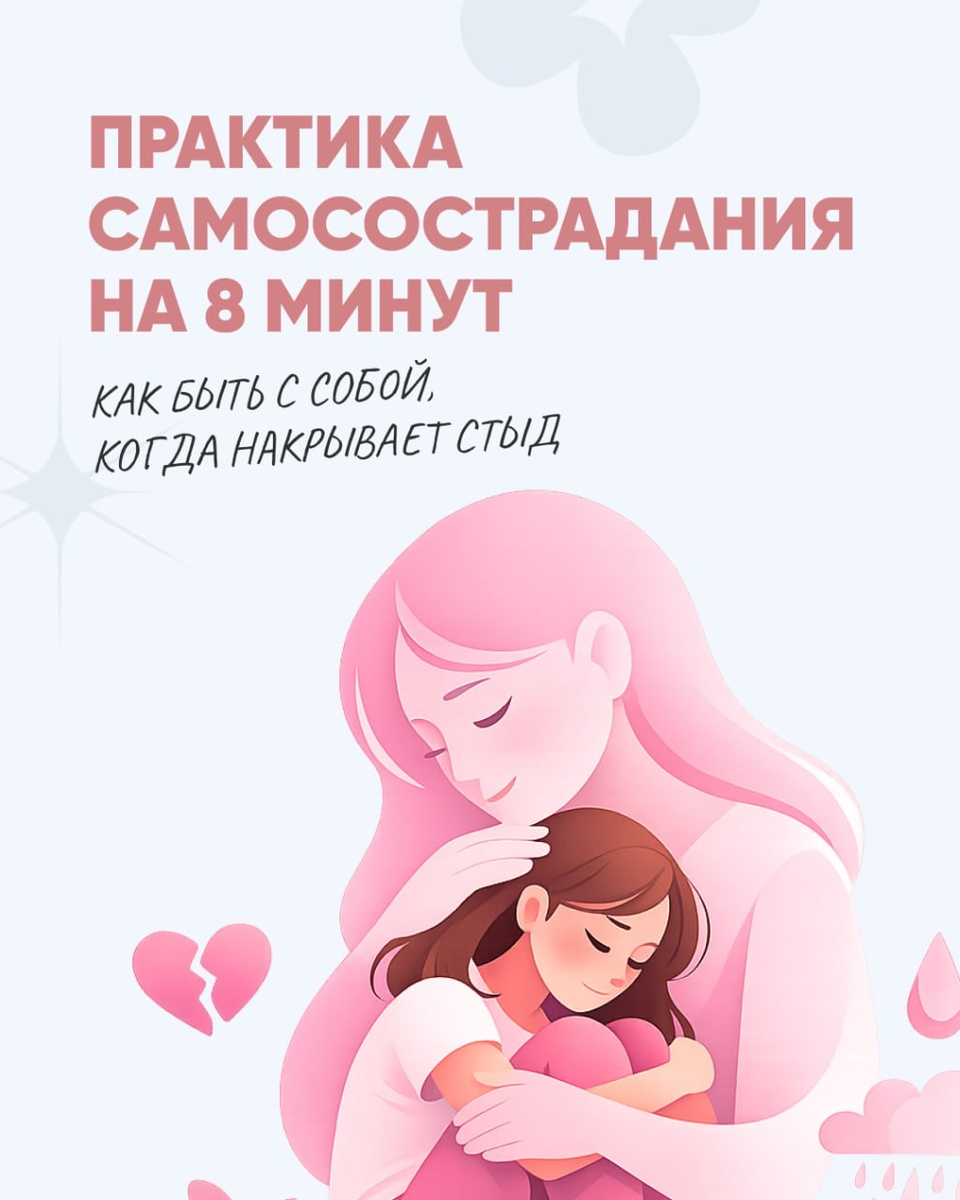 Когда накрывает стыд, рациональное мышление отключается. Мозг включает древние механизмы самобичевания. Эта практика помогает создать рядом с чувством пространство заботы, чтобы пережить волну, не разрушаясь. Основана на трёх принципах (К. Нефф): • Осознанность — замечать без погружения • Общечеловечность — помнить, что все ошибаются • Доброта к себе — как к лучшему другу ШАГИ (8 минут): 1. Присутствие (1 мин). Сядьте комфортно. Почувствуйте тело: контакт с поверхностью, вес, дыхание. 2. Найти стыд в теле (1 мин). Где он живёт? (сжатие, жжение, тяжесть). Отметьте: «Здесь есть стыд». 3. Контакт (2 мин). Положите руку на это место. Спросите: «Что тебе нужно сейчас?» Ждите ощущений, а не слов. 4. Воспоминание доброты (1 мин). Вспомните момент, когда вас принимали, несмотря на сложности. Направьте это чувство к месту стыда. 5. Общечеловечность (1 мин). «Все через это проходят. Я не одна. Это делает меня человеком». 6. Дыхание-мост (2 мин). Вдох — замечаете стыд. Выдох — направляете
