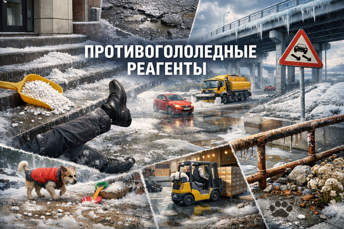 Как правило, зимой противогололёдный материал выбирают по остаточному принципу: что дешевле, что есть под рукой и что «в прошлый раз вроде сработало». Итог предсказуем: повреждённые покрытия, ускоренный износ конструкций, грязь в помещениях и, что самое неприятное, травмы людей.