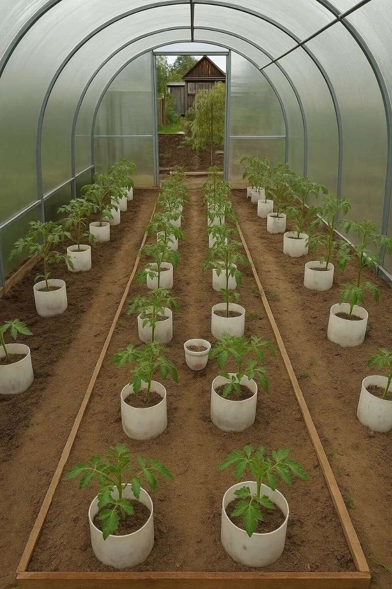 зоны — это действительно даёт много преимуществ: На заметку 👇 Преимущества вашего способа: 1️⃣Локальное удобрение Компост концентрируется именно в нужной зоне, без лишнего перераспределения по всей грядке. 2️⃣ Экономия воды Влага сохраняется дольше в "колодце", что особенно важно в жару или при редких поливах. 3️⃣ Контроль за сорняками Пространство между емкостями можно мульчировать или использовать под другие культуры — меньше сорной травы. 4️⃣Сопутствующая посадка Между банками можно высадить уплотнители: базилик, лук, морковь, укроп, петрушку — полезно и красиво. 5️⃣Уход за корнями Выращивание в один стебель и обрезка донышка позволяют легко контролировать рост и подсыпать землю, стимулируя развитие дополнительных корней. 6️⃣ Два корня — один стебель Способность получить удвоенный урожай с компактного куста при грамотной формировке.