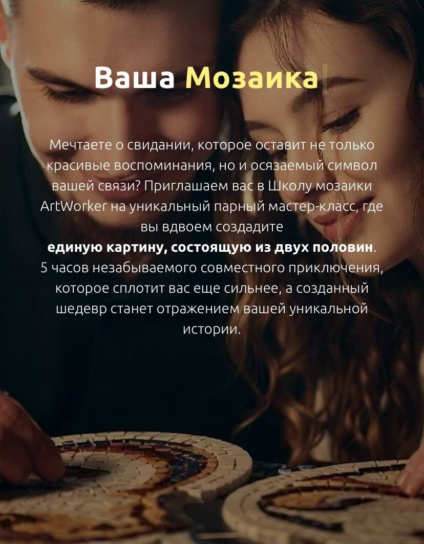 ? ❤️ Скажите нет банальным ужинам и кинотеатрам: мы приглашаем вас на арт-свидание в Школу мозаики 💌 ✨создайте новый символ вашей любви — картину, где каждая половина прекрасна сама по себе, но лишь вместе они образуют совершенное целое 👩❤️💋👨 ✨отвлекитесь от повседневных забот на смех, лёгкие прикосновения и гордость за совместный результат ✨проведите до 5 часов с любимым человеком в уютной атмосфере нашей студии под чутким руководством мастера — это ваша личная история, воплощённая в мозаике 🧩 В галерее представлены примеры эскизов парных «диптихов», подробнее с программами для влюблённых можете ознакомиться на сайте Школы _________________________________ Места на амурные выходные заканчиваются — решайтесь и бронируйте 😉🔽 📞 +79951204400 📩 school@artworker.pro или через форму обратной связи С любовью, Ваш ArtWorker 🧡