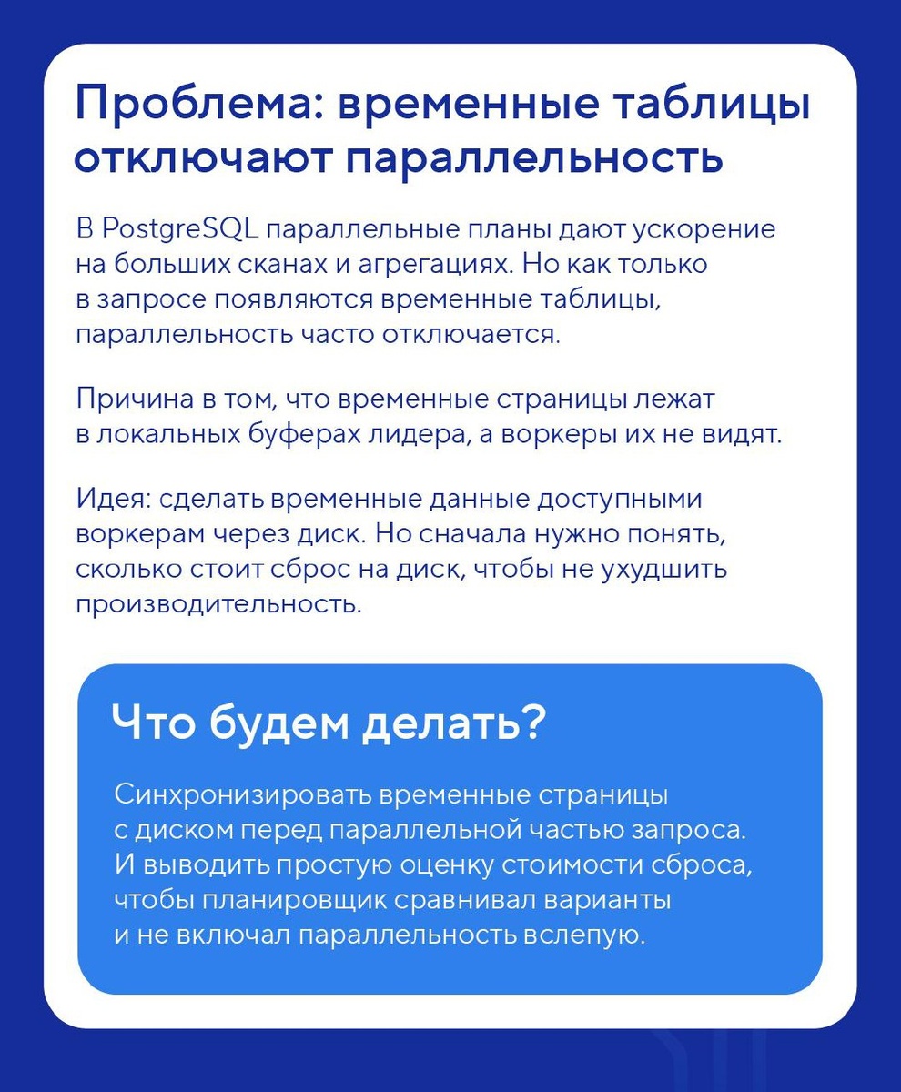 В PostgreSQL параллельность часто упирается во временные таблицы: воркеры не видят локальные буферы лидера, и параллельный план просто не включается. Выход: перед параллельной частью сбросить измененные временные страницы на диск и дальше не менять таблицу. Тогда воркеры смогут читать ее параллельно. Но сброс может стоить дорого, поэтому его нельзя включать вслепую. В карточках показали, как измерить цену такого сброса, какие счетчики для этого нужны и как свести результаты к простой оценке, чтобы планировщик выбирал параллельность только там, где она реально окупается. Полная версия — на Хабре.