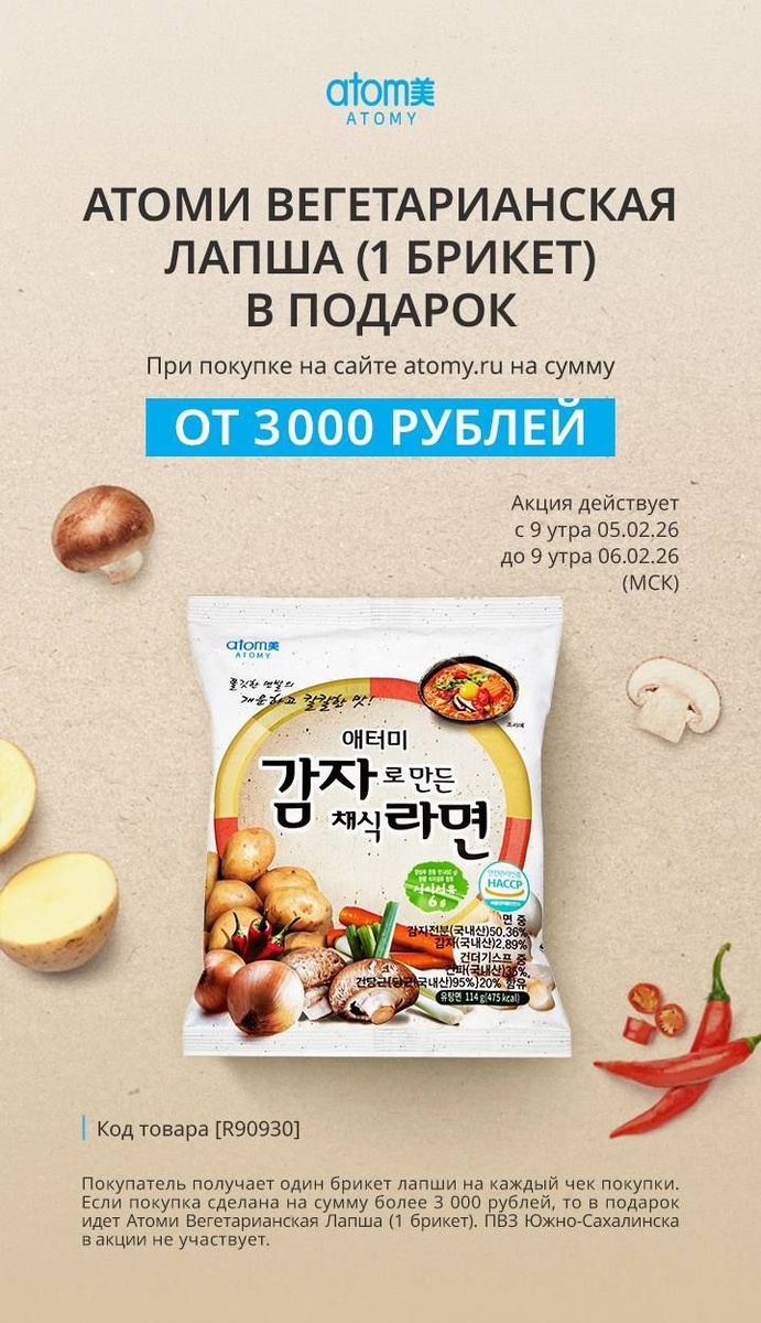 ! Клади в корзину необходимые и любимые продукты на сайте Атоми на сумму от 3 000 ₽ и в период акции (с 9:00 05.02.26 до 9:00 06.02.26 МСК) получай в подарок упаковку нашего особенного рамена. Почему этот рамен стоит попробовать: ✅Картофельная основа — натуральный картофельный крахмал и больше пищевой клетчатки. ✅Полезные ингредиенты: шиитаке, зелёный лук, морковь и морская капуста. ✅Без ГМО и трансжиров. ✅Без глутамата натрия — наслаждайтесь вкусом без лишних переживаний. ✅Острый перчик добавляет пикантности. ✅Готовится за пару минут — просто залейте кипятком. ✅Подойдёт и на завтрак, и на ужин — удобно для занятых дней и неожиданных гостей. Идеально для: ✅ленивых понедельников ✅занятых вторников ✅встреч с гостями ✅случаев, когда готовить совсем нет времени Условия акции: • Подарок при покупке от 3 000 ₽ • Период: с 9:00 05.02.26 до 9:00 06.02.26 (МСК). Хотите получить подарок? Добавляйте товары в корзину и оформляйте заказ в период акции. Если нужны подсказки или помощ