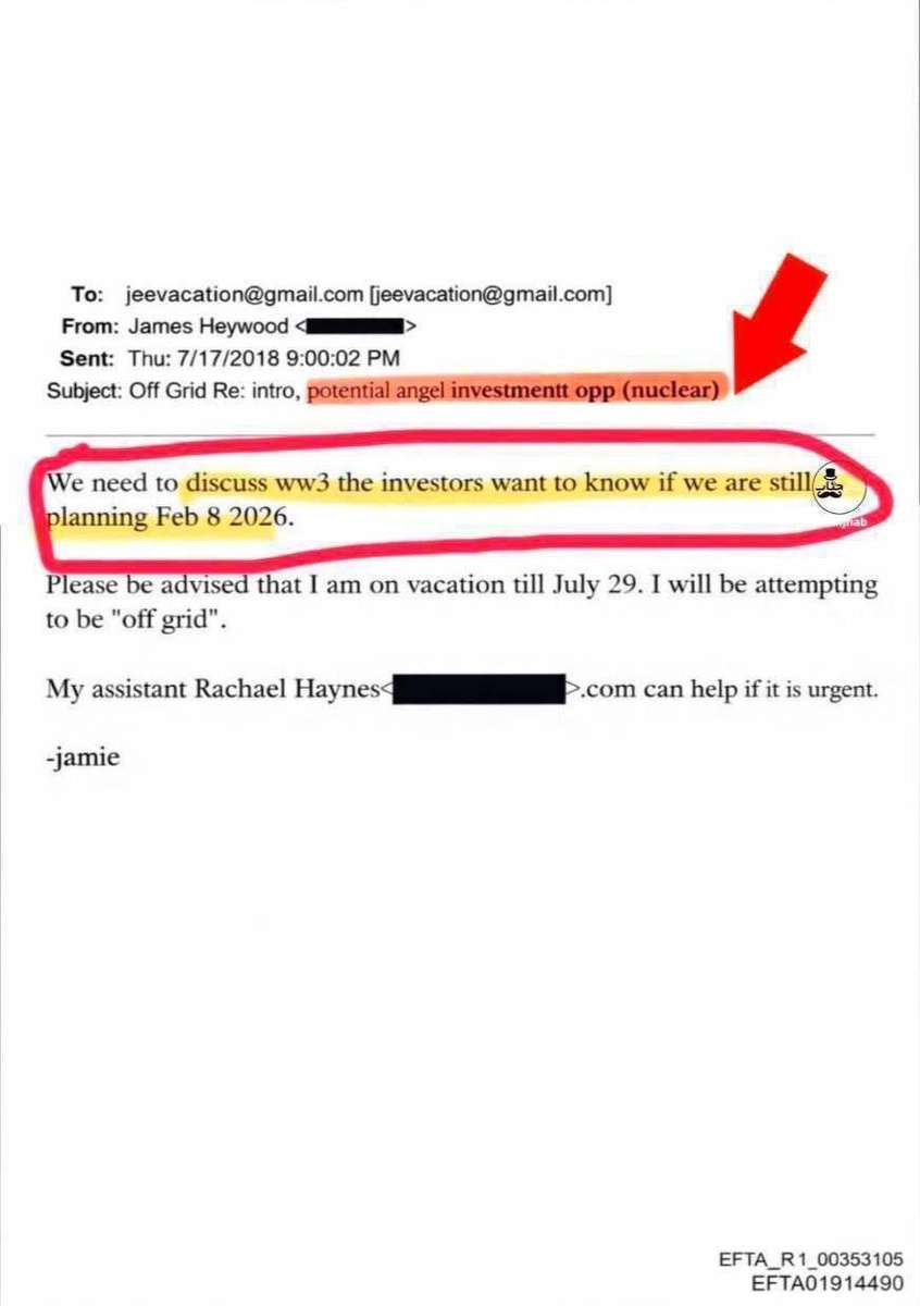 В одном из документов Эпштейна сообщается, что Третья мировая война начнётся 8 февраля 2026 года.