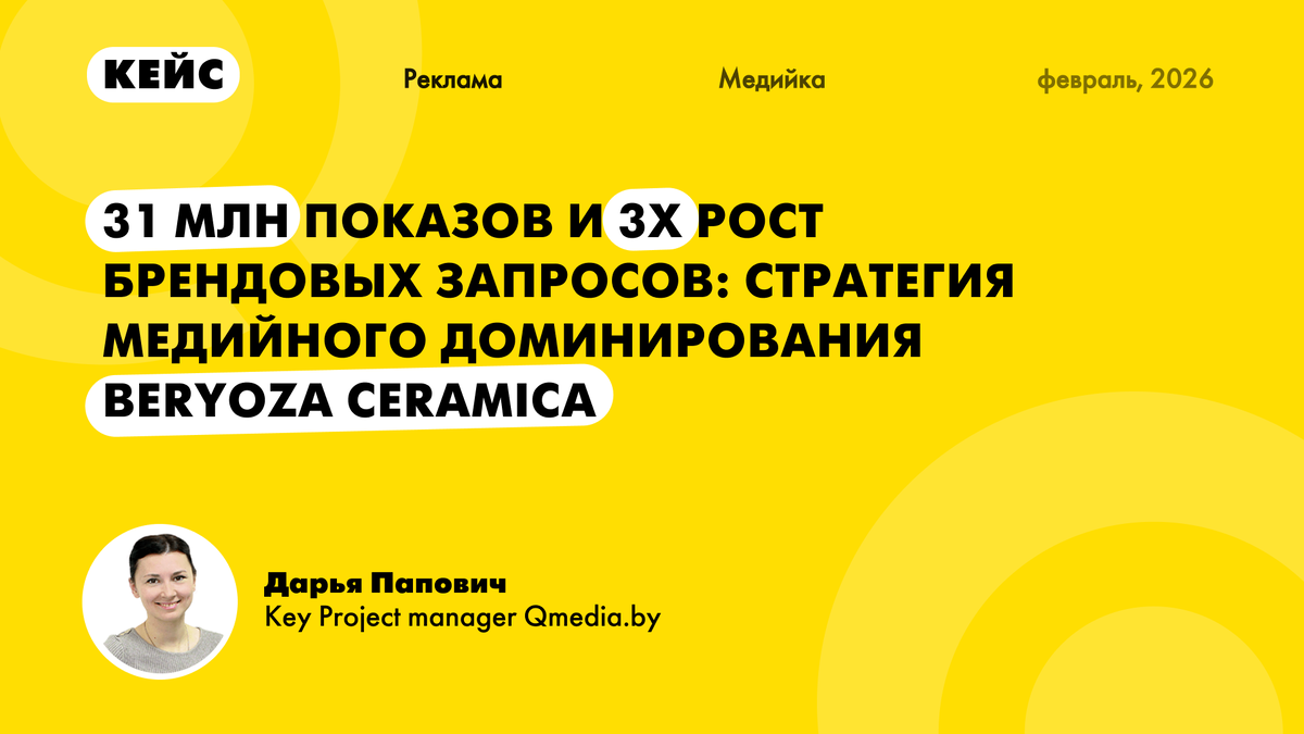 Медийная реклама в Яндекс для BERYOZA CERAMICA не только обеспечила десятки миллионов показов, но и доказуемо повлияла на спрос, поиск и интерес к бренду, заложив основу для дальнейшего роста performance-показателей.