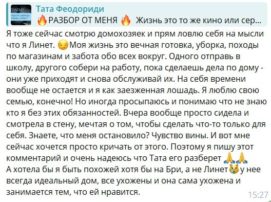 ОНИ МОЛЧА ВЫГОРАЮТ 🙏Я благодарна, что вы делитесь своими историями и моя задача в ответ на ваше доверие дать вам ответ максимально честный и глубокий. На самом деле - этот «крик души» - НЕ про усталость. НЕ про «много дел» и не про «плохо организованное время». В этой истории очень ясно слышно чувство вины и старый, знакомый сценарий: «я должна быть хорошей девочкой». А дальше всё по классике: сначала все остальные, потом, если вдруг останутся силы — вы. А если вы все-таки выбираете себя раньше, чем других, внутри включается: «стыдно», «эгоистка», «так нельзя». Именно чувство вины здесь главный стоп-кран. Оно не даёт ни отдохнуть, ни захотеть, ни пойти за собой. Оно держит в роли «я всё выдержу», пока внутри накапливается пустота и злость. Я уже показывала, как работает этот механизм в разборе Эльзы из «Холодного сердца». Там тоже была жизнь под девизом «быть хорошей для всех», пока всё внутри не начало трещать по швам. 🫠Если не видели - очень советую посмотреть и поразмышлять