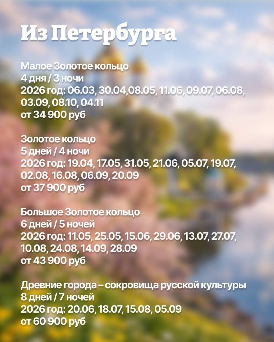 🔥 В продаже готовые экскурсионные программы с фиксированными датами и насыщенными маршрутами. Классические и расширенные варианты, разная продолжительность туров, выезды из СПб и МСК.