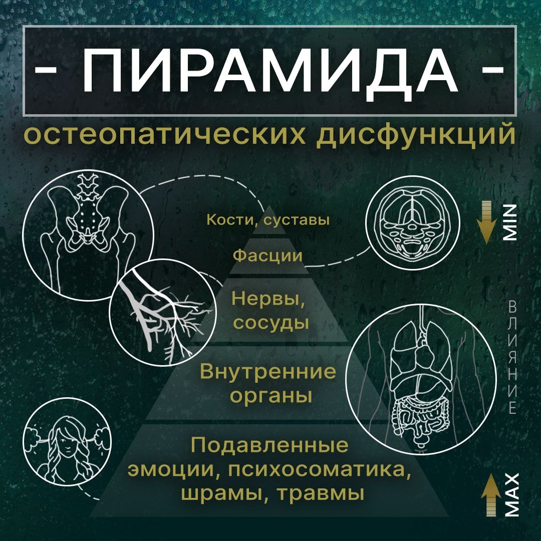 или Иерархия остеопатических дисфункций Или что максимально влияет на состояние здоровья человека Постоянно об этом рассказываю на сеансах и теперь руки дошли до написания поста. Итак, самое большое влияние на устойчивость пирамиды влияет её основание. 🔸Подавленные эмоции, психосоматика, шрамы, травмы Без отработки на сеансах основания, вся остальная работа выше даёт только временный эффект. Отсюда, кстати, и моё желание работать комплексно и минимум блоками по 3 сеанса. Отработали основание, поднимаемся на ступеньку выше 🔸 Внутренние органы Спазмированный или поврежденный орган всегда утащит за собой позвонок. Вправление позвонка лишь временная мера, если не решить вопросы с органом. 🔸 Нервы, сосуды Сеть у нас по всему телу и часто есть эмоциональные сосуды, которые приход, в спазм от эмоций хозяина или виной будут адгезии и травмы. 🔸 Фасции, мышцы Тут особенно сказать нечего. Так как они по всему телу и важно когда они функционируют верно и не спазмируются 🔸 Кост