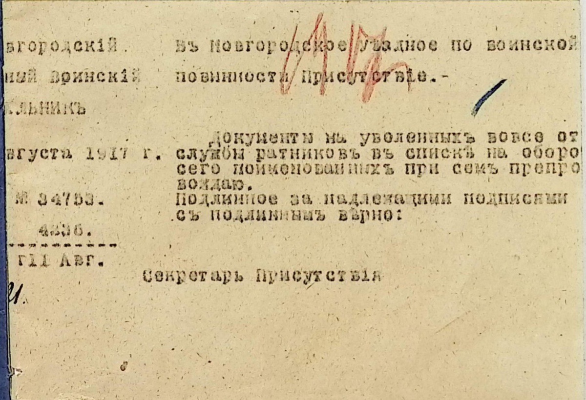 ГАНО-Новгород ф.Р-247 оп.5 св.59 д.4744. Дело о назначении пенсии гражданину деревни Голино Шимской волости Логинову Федору. 1917 Про ранение Федора было известно с сайта о Первой мировой войне из Списка потерь и из Картотеки бюро учета потерь в Первой мировой войне. К этому моменту уже было ясно, что отца Федора звали Яков, а не Василий, как не замазано на сайте Память Народа.