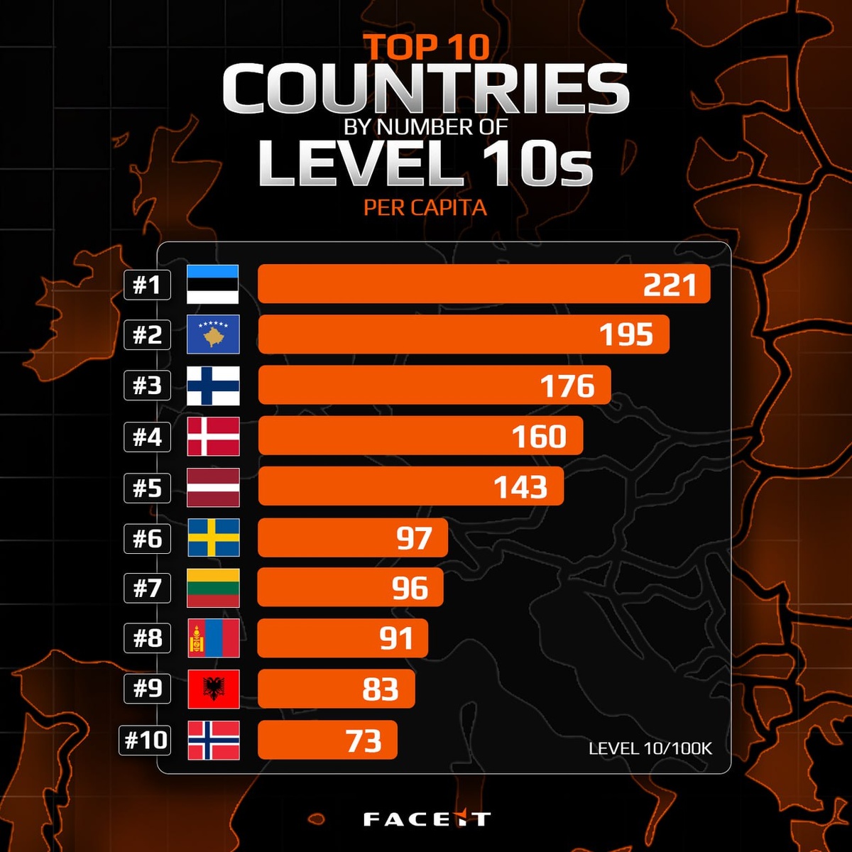 🇬🇧 FACEIT опубликовали статистику стран с самым высоким числом игроков 10 уровня на 100 000 населения.