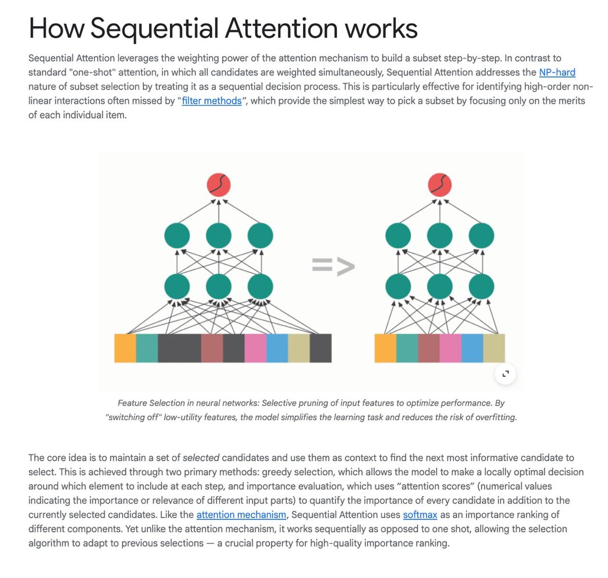 В новом исследовании Google представили подход под названием Sequential Attention. Идея простая по смыслу, но мощная по эффекту - модель учится фокусироваться только на действительно важных частях вычислений, а всё лишнее постепенно отбрасывает. Почему это вообще проблема Современные нейросети огромные. Они: - считают слишком много - используют кучу признаков и параметров - тратят много памяти и энергии При этом далеко не всё, что модель обрабатывает, реально влияет на итоговый ответ. Но определить заранее, что важно, а что нет - математически очень сложно. Что делает Sequential Attention. Метод работает пошагово. Вместо того чтобы сразу использовать всё, алгоритм: 1. Выбирает один самый полезный компонент 2. Смотрит, что уже выбрано 3. Добавляет следующий, который даёт наибольшую пользу 4. Повторяет процесс последовательно То есть модель как будто собирает себя заново-— из самых значимых частей, а не из всего подряд. Что это даёт на практике - Меньше вычислений - модель рабо