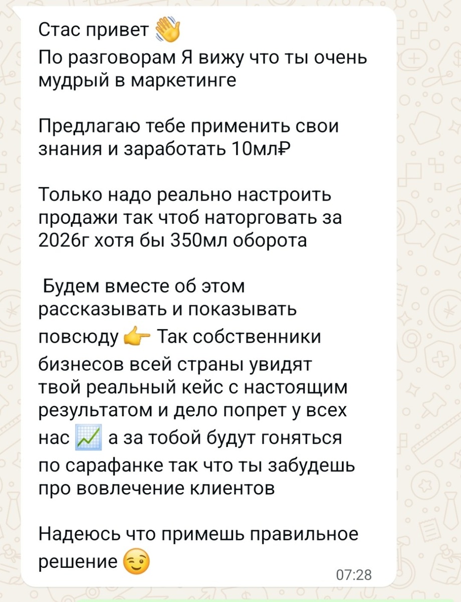 Мне часто прилетают такие заманчивые предложения, отказать которым (по мнению автора) страшный грех с высшей степенью глупости... но давайте углубимся 😘 ❤️ Предыстория со смыслами тут, тоже отрезвляет. ⤵️Сегодня без лирики - только разбор офера между строк... 1) 10 млн из 350 = 2.85%. Звучит круто, но не для тех, кто в школе учился на 4+ и уже на опыте. Меньше 3% - это ставка курьера, но не партнера с ТАКОЙ ответственностью. Если клиент и правда считает эксперта опытным и уважает его, то догадался бы, что такое ему не зайдет. Стало быть - на лицо лесть, сарказм и токсичная манипуляция под маской комплимента. 2) Без подробностей, описания ниши, метрик, целей и задач - предлагать 10 млн в качестве награды - это уровень студента, который заманивает более ценного, чем он сам, партнера в свой проект, т.к. понял, что сам не вывозит. Что-то мне подсказывает, что сюжет фильма "Спиздили" (и оных) как раз об этом... Легкая добыча, отключение логики и здравого смыла, обещания золотых гор.