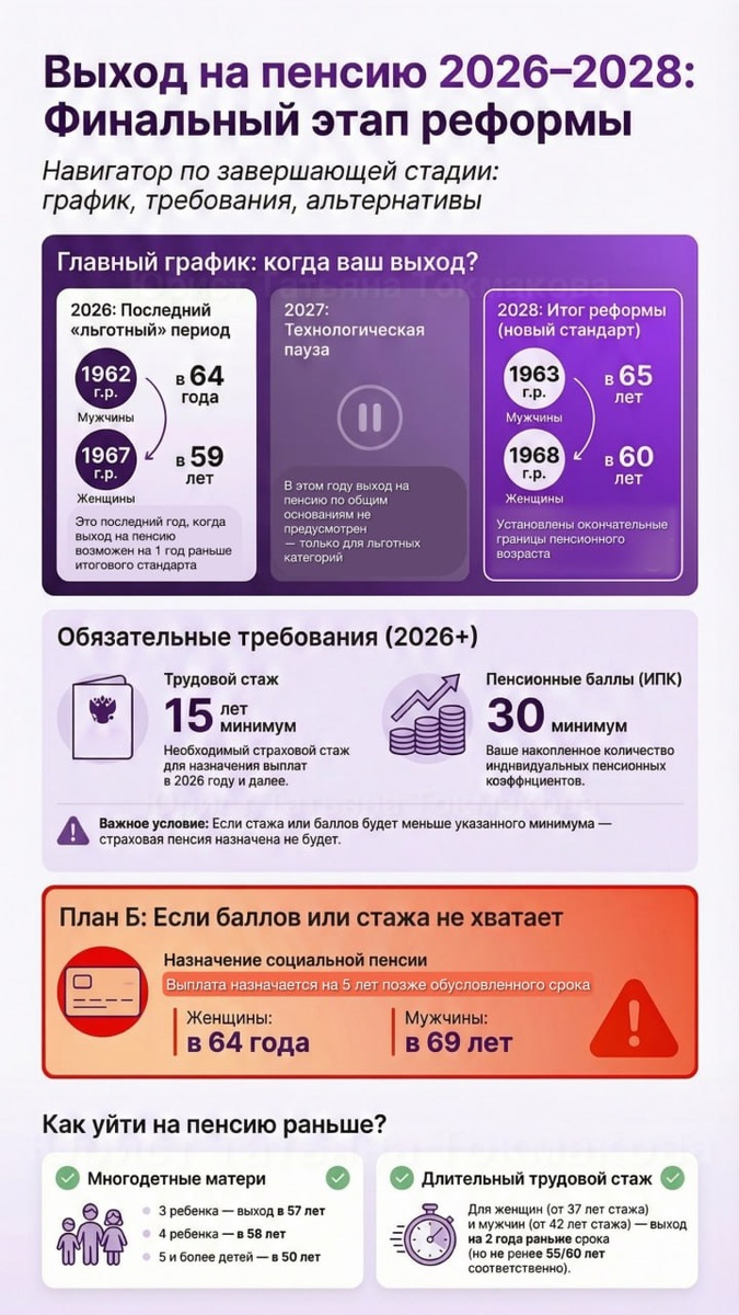 »🚪 Мы только что обсуждали «щедрость» в 156 рублей за балл (кто пропустил — пост выше 👆) Но есть новость пострашнее: чтобы получить даже эти крохи, нужно пройти квест до конца... ⏳ Этот год — завершающий в переходном графике СФР У Вас есть последний шанс выйти на заслуженный отдых чуть раньше общего срока (на 1 год): 👩 Женщины 1967 г.р. — в 59 лет 👨 Мужчины 1962 г.р. — в 64 года 🔒 С 2027 года — никаких поблажек Женщины строго с 60 лет, мужчины — с 65. Если закон снова не перепишут, это наш новый стандарт на десятилетия Мало просто дожить до возраста. Чтобы Вам одобрили страховую пенсию, на Вашем лицевом счете должно быть: — Не менее 15 лет стажа — Не менее 30 пенсионных баллов 🫸 Нет 30 баллов? Нет страховой пенсии. Ждите социальную еще 5 лет. Жестоко? Да. Но это реальность 2026 года Закажите выписку из ИЛС на «Госуслугах» прямо сейчас. Проверьте, хватает ли Вам баллов и стажа, пока еще есть время что-то предпринять 🫡 Финальный свисток прозвучал, реформа официально заверше