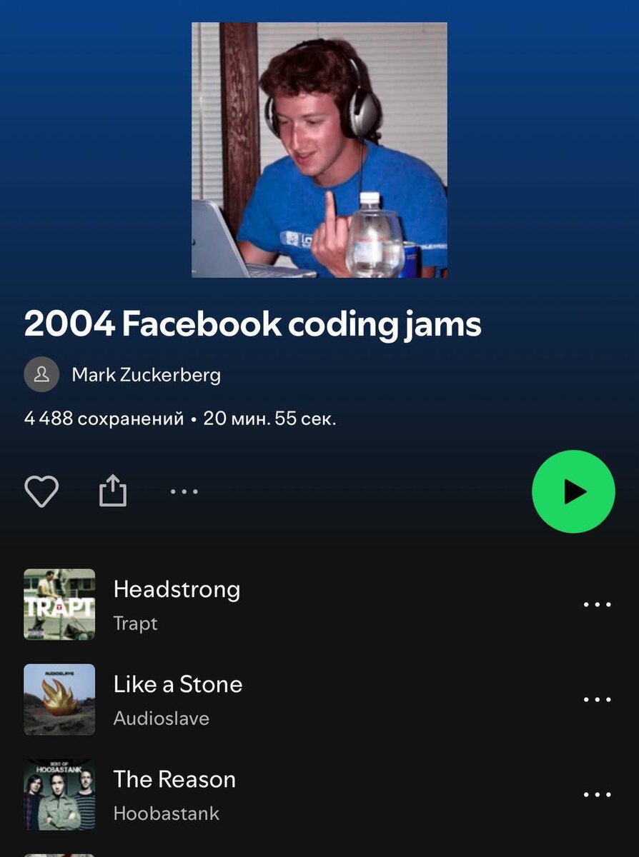 На Spotify опубликован плейлист из пяти треков, под который Марк Цукерберг работал над созданием Facebook в 2004 году. Ссылка на плейлист: open.spotify.com/playlist/0bkc5te49gojmrfavc1sn4 https://dzen.ru/id/5c0e38ff46ef5c00aaa80527