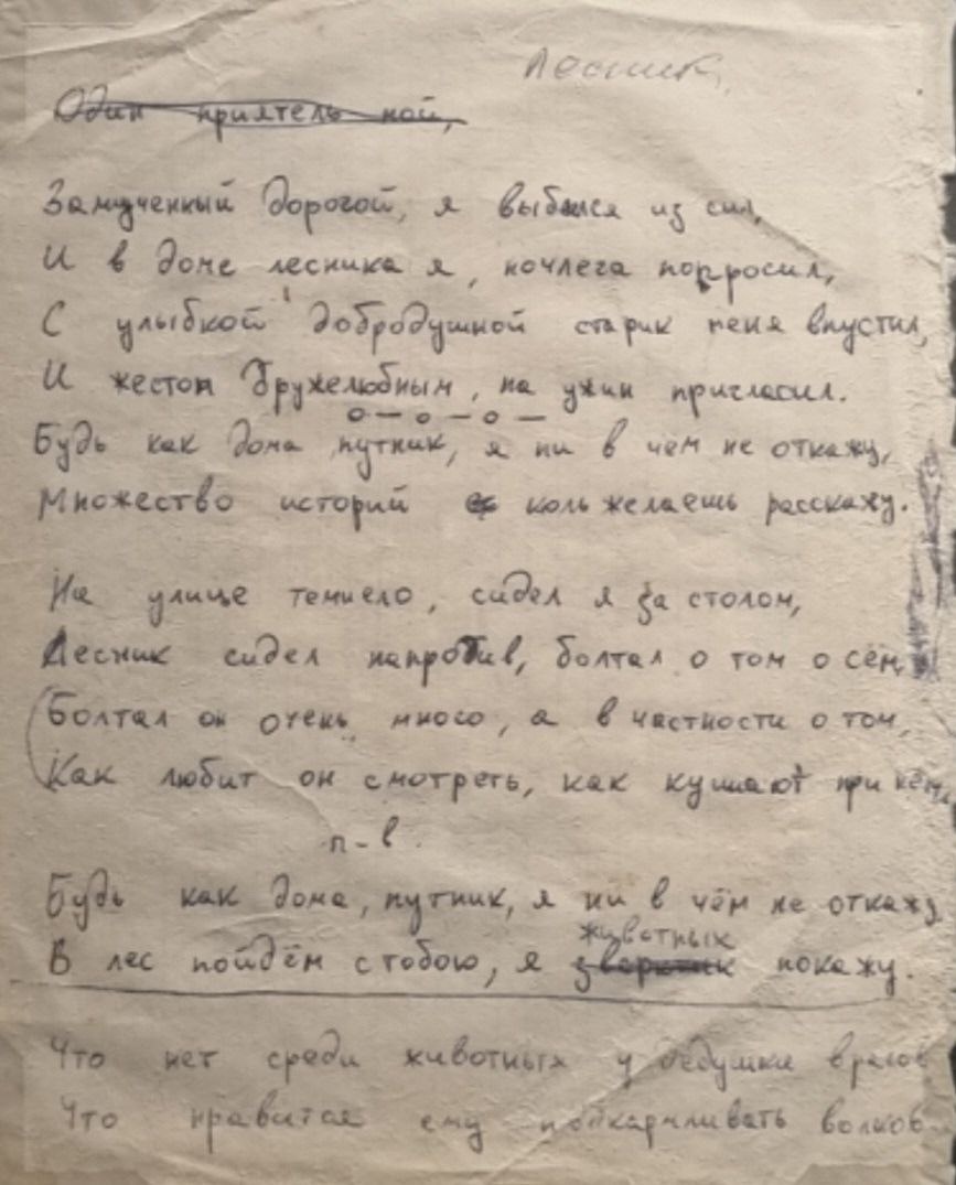 Черновик текста песни "Лесник", самая первая версия. Текст «Лесника» был написан Андреем Князевым, а музыка – Михаилом Горшенёвым в 1991 году. Именно эта песня сыграла ключевую роль в судьбе группы: благодаря ей коллектив сменил название с «Контора» на «Король Шутов», а затем на «Король и Шут». Впервые песня прозвучала в клубах в 1993 году и вошла в магнитоальбом «Истинный убийца» под первоначальным названием «Будь как дома, путник». В этом альбоме было сразу две версии композиции. Позже, в 1997 году, песня появилась в студийной версии альбома «Король и Шут» и обрела свое нынешнее название – «Лесник». «Лесник» — там сказано всё. Весь «Король и Шут». Хотите понять, что такое «Король и Шут» — послушайте «Лесника». (с) Михаил Горшенёв