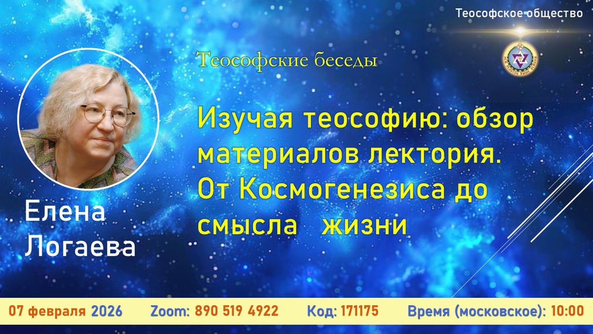 ОТ КОСМОГЕНЕЗИСА ДО СМЫСЛА ЖИЗНИ" Ведущая: Елена Алексеевна Логаева, Отделение "Белый Лотос", г.Москва. 🔔 ДАТА: суббота, 7 февраля 2026 г. Начало в 10:00 (время московское). ⏺️⏺️⏺️Вход в ZOOM: www.zoom.us Id: 890 519 4922 Pass: 171175 ⚡️Быстрый вход в лекторий по ссылке: https://clck.ru/37Q6hC 👉Предварительная регистрация и установка программ - не нужны. Участие - бесплатное. Включение вашей персональной камеры - не требуется. ‼️Все вопросы вы можете направить по адресу: secretary@ts-russia.org ☀️Добро пожаловать!