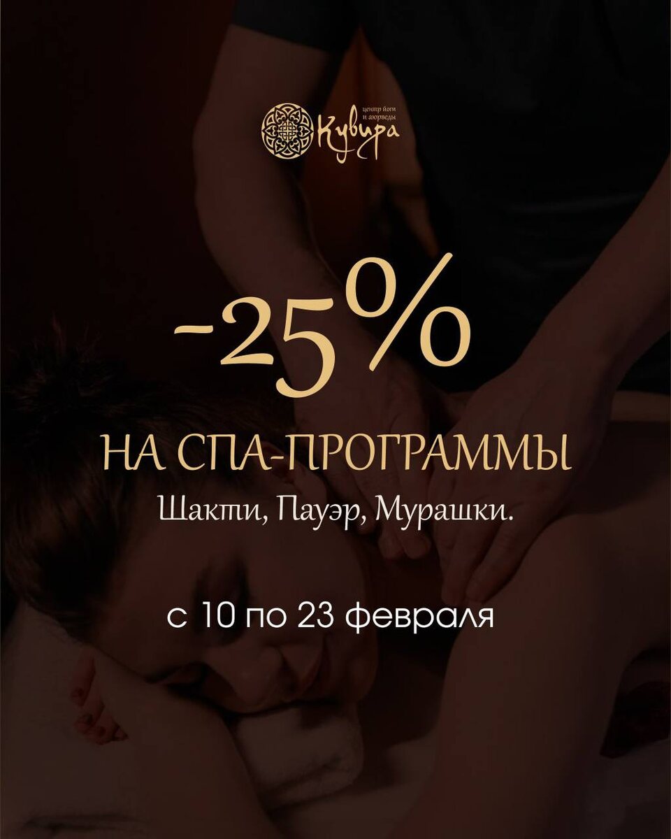 — −25% на три наших любимых программы! Каждая SPA-программа — это подарок себе и тем, кого мы любим. В Кувире мы создаём пространство, где тело отдыхает, а разум находит ясность. 🎁 Шакти Терапия — мягкое глубокое расслабление. 🔥 Power Therapy — восстановление силы и энергии. 💑 Мурашки — синхронный отдых для двоих. 💁🏼♀️ Идеально как подарок на 14 февраля и 23 февраля — внимание, забота, искренний отдых. 📞 Записаться можно через администратора @YogaKuvira ✨ Спешите — акция до 23 февраля включительно.