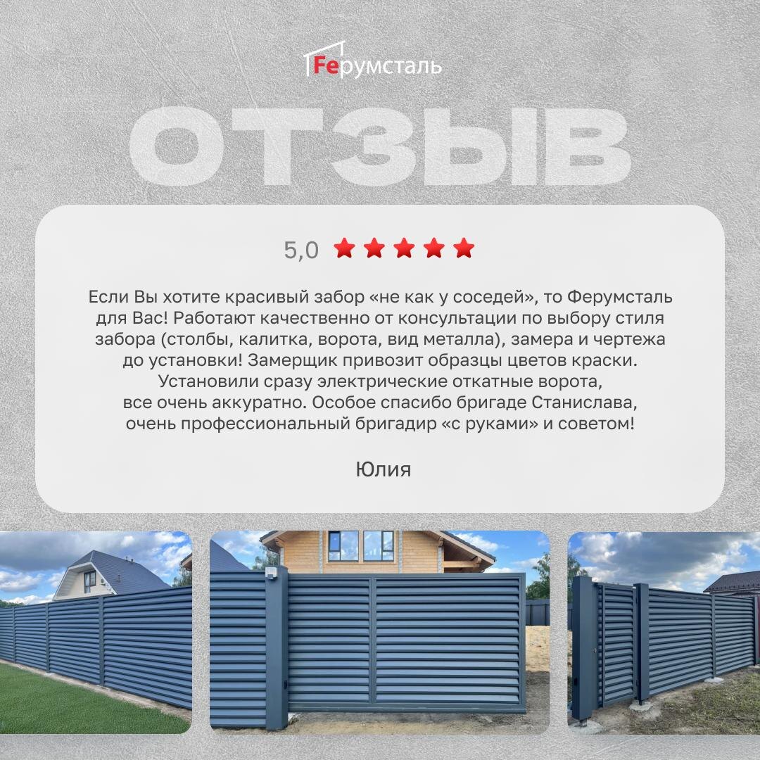 ! ⭐️ Вы можете оставить отзыв о работе с нашей компанией в официальном сообществе ВК и Яндексе. ferumstal.ru | +7 (495) 135-16-49 💬 Есть вопрос? Напишите нам Подписывайтесь на Feрумсталь 💙 VK • 📝 Дзен • 📺 Youtube • 📺 Rutube #заборжалюзи #ферумсталь #отзыв