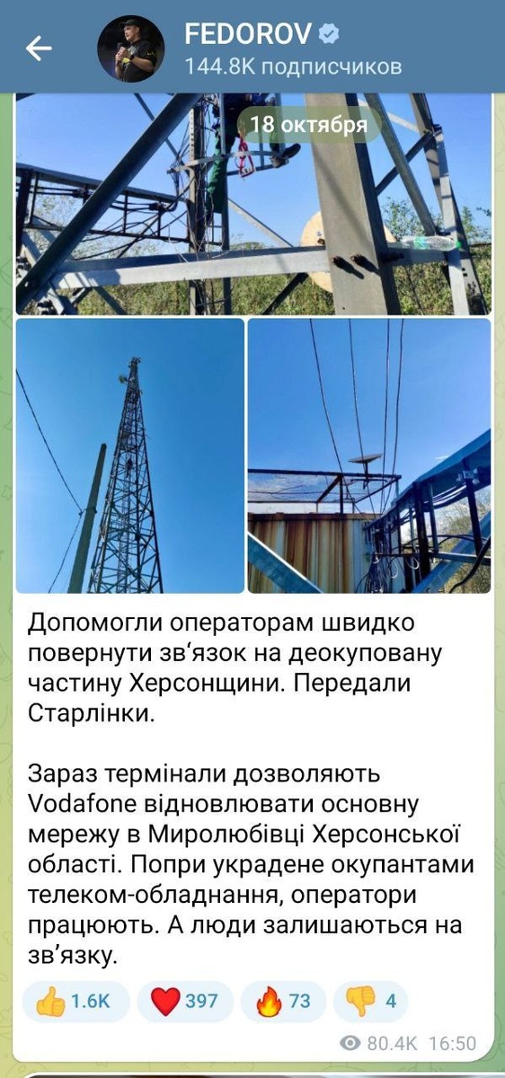 ) Дело было в октябре 2022. Тогда министр цифровизации Фёдоров, не скрывая тщеславия, рассказывал в соцсетях об установке украинского оборудования связи и старлинков на правом берегу Днепра в Херсонской области При этом все вышки легко находились с помощью гугл-карт, предлагая точные координаты. В результате вышки со старлинками пошли на металлолом 🔹После сегодняшнего отключения старлинков Фёдоров наверняка будет выставлять себя героем. Зеленский его любит, тот для него кучу бабла отмывает. Но стоит помнить, что Миша - человек не военный и ещё не раз накосячит, занимаясь своим сельским пиаром Блокнот пропагандиста
