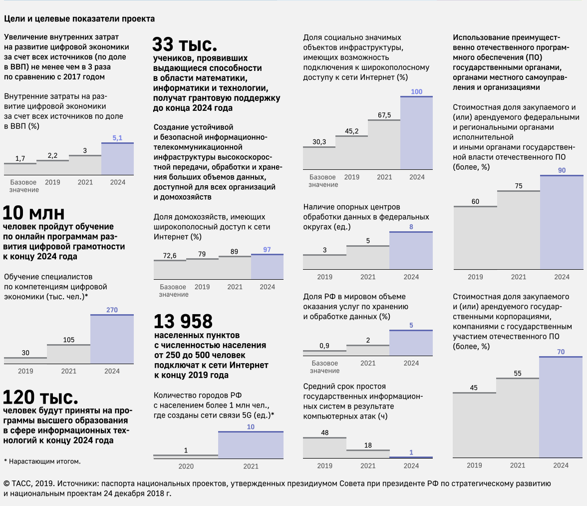 Цифровизация в XXI веке превратилась в мощный драйвер экономического роста, который предоставляет широкий инструментарий как для государства, так и для бизнеса множество решений, которые облегчают и ускоряют большое количество процессов в экономике и социальном взаимодействии. В то же время, как цифровизация создает множество положительных эффектов для экономики, в равной степени она может создавать системные риски, способные подрывать экономическую стабильность, суверенитет и влиять в глобальном смысле на будущее страны. Риски, которые несет за собой цифровизация, происходят в разных сферах деятельности человека, но особую актуальность приобретают три группы рисков: • Кибербезопасность; • Монополизация цифровых рынков; • Рост безработицы. В федеральных масштабах в России реализуется национальный проект «Цифровая экономика», целями которого являются: • повышение внутренних затрат на развитие цифровой экономики за счёт всех источников (по доле в валовом внутреннем продукте страны) не м