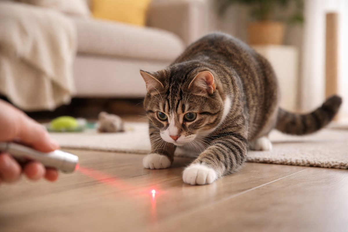 Лазерная указка давно стала популярной игрушкой для кошек. Маленькая светящаяся точка, стремительно двигающаяся по полу и стенам, моментально привлекает внимание питомца. Кошка бегает, прыгает, «охотится» – со стороны кажется, что это идеальный способ занять животное и дать ему выплеснуть энергию. Однако за внешней безобидностью этой игры скрываются серьёзные риски. Кошка по своей природе – хищник. Даже самый домашний и спокойный питомец живёт по заложенным природой инстинктам. Любая охота должна иметь завершение: добыча поймана, обезврежена, съедена или хотя бы «побеждена». Именно этот финал даёт животному чувство удовлетворения и внутреннего равновесия. Лазер нарушает несколько базовых принципов охотничьего поведения. 1. Добыча не исчезает по естественным правилам.